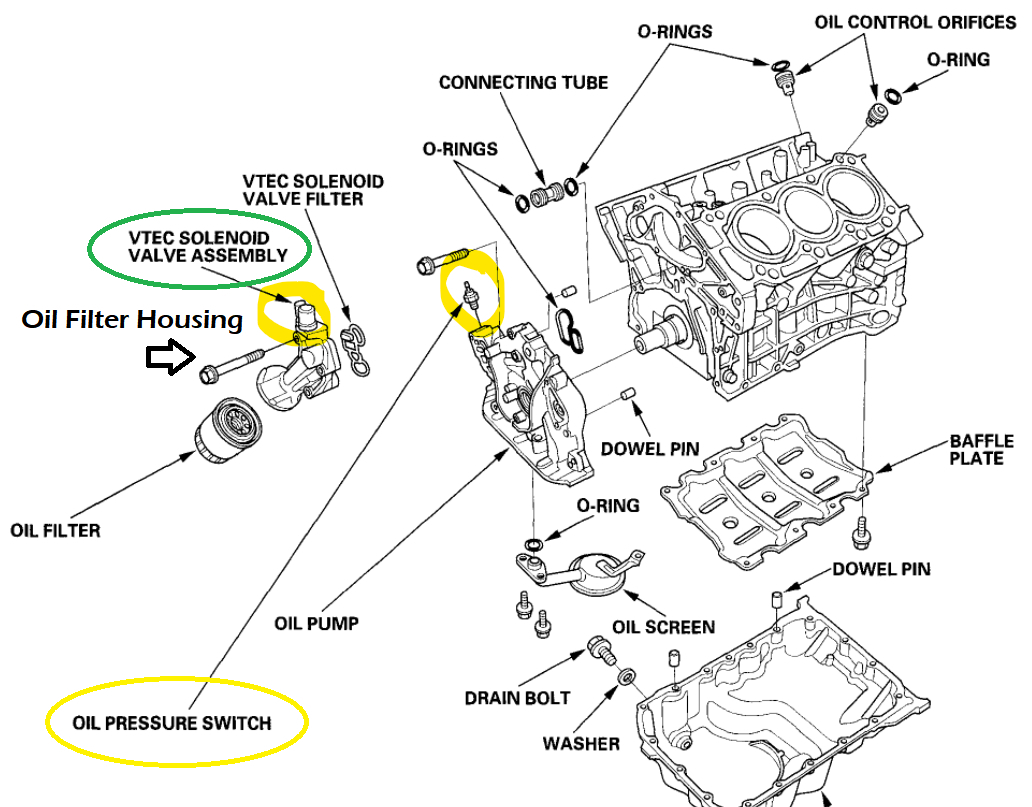 The green/white wire that has a connector, then it turns into a green wire with a yellow stripe on it is the VTEC solenoid and is attached to the oil filter housing that you took off. Go by the wire colors. And remember that they have a solid color with a stripe down the wire. Thats how they're colored. The oil pressure switch is a yellow wire with a red stripe. It will be in the same area, but it is not attached to the actual oil filter housing.