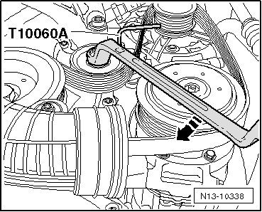 - To release the tension on the ribbed belt, turn the tensioner in the - direction of the arrow - from underneath.
