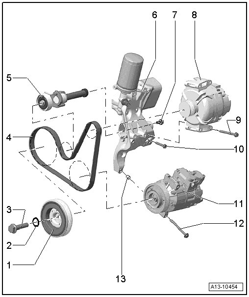 - First, install the ribbed belt on the vibration damper, then on the A/C compressor and generator.