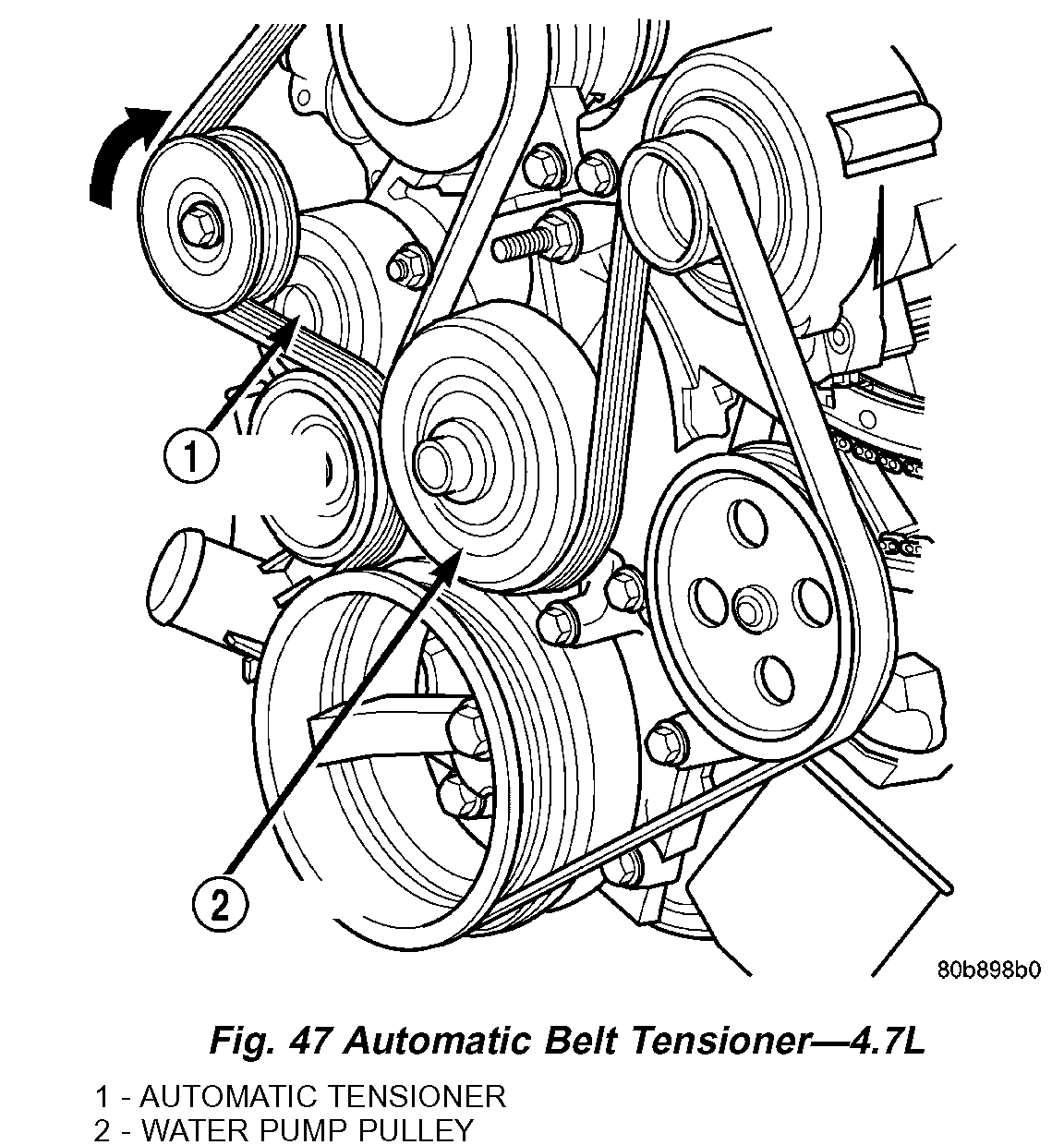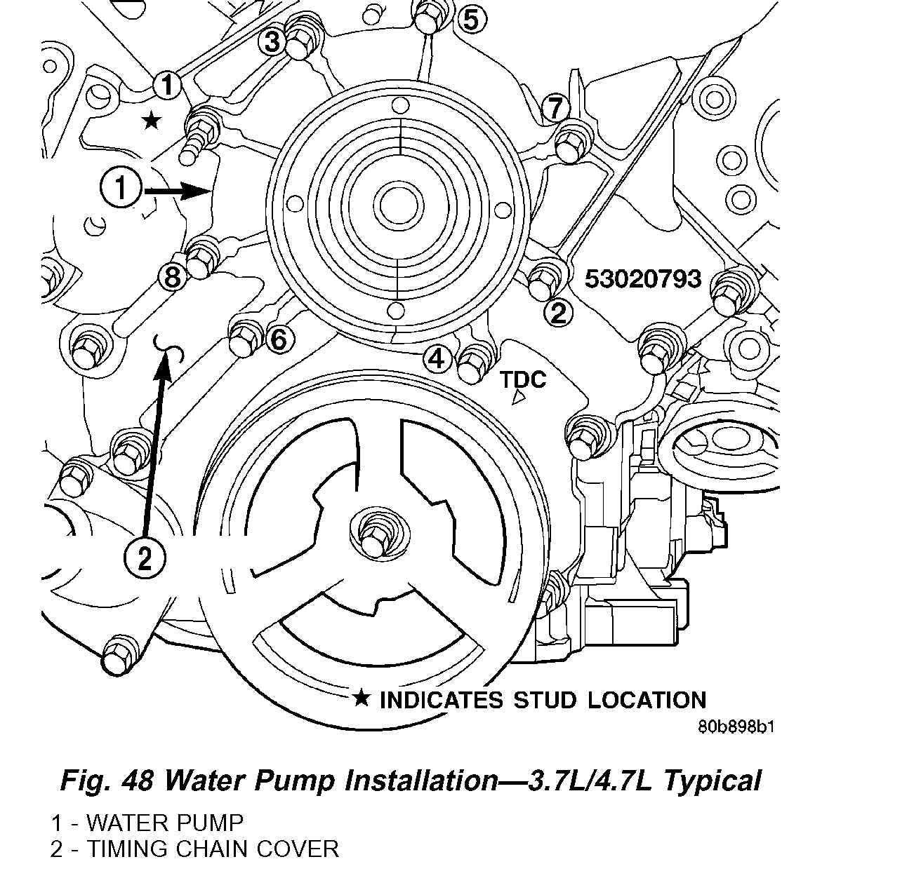 The water pump on 3.7L/4.7L engines is bolted directly to the engine timing chain case cover.