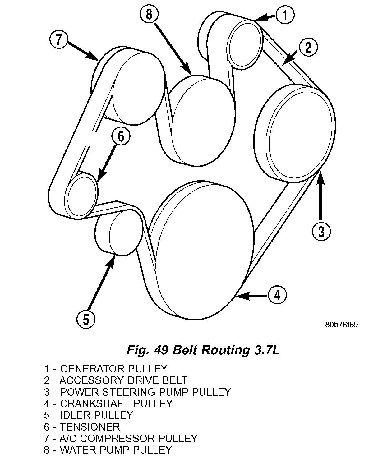 Caution: When installing the serpentine accessory drive belt, the belt must be routed correctly. If not, the engine may overheat due to the water pump rotating in the wrong direction. Refer to figure for the correct belt routing. Or, refer to the Belt Routing Label located in the engine compartment. The correct belt with correct length must be used.