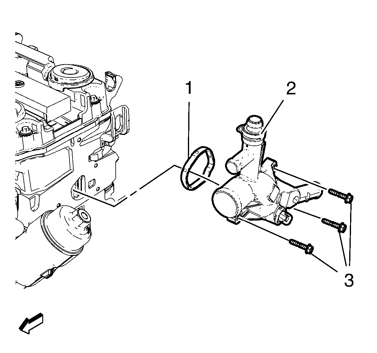 3. Install the 3 water outlet bolts (3) and tighten to 8 Nm (71 lb in).