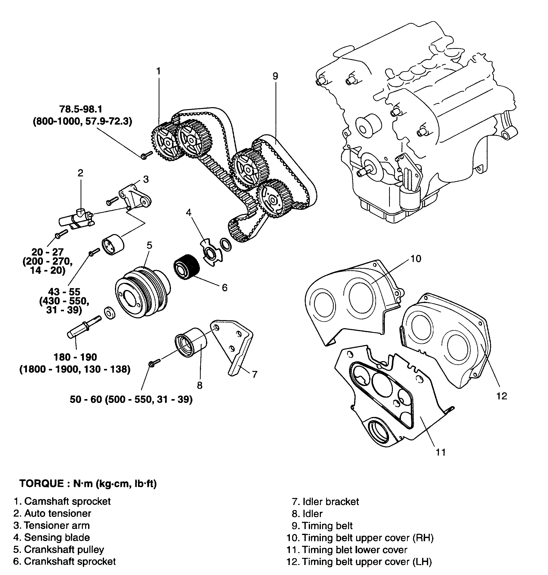 3. Remove the timing belt cover, the auto tensioner and idler pulley.