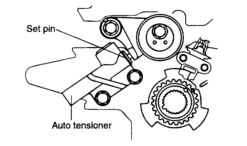10. Pull out the auto tensioner set pin after adjusting timing belt tension. See: Timing Belt Tensioner > Adjustments
