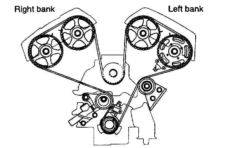 6. Align the timing marks of each sprocket and install the timing belt in this order. Crankshaft sprocket --> Idler pulley --> Exhaust camshaft sprocket (LH) --> Intake camshaft sprocket (LH) --> Water pump pulley --> Intake camshaft sprocket (RH) --> Exhaust camshaft sprocket (RH) Tensioner pulley