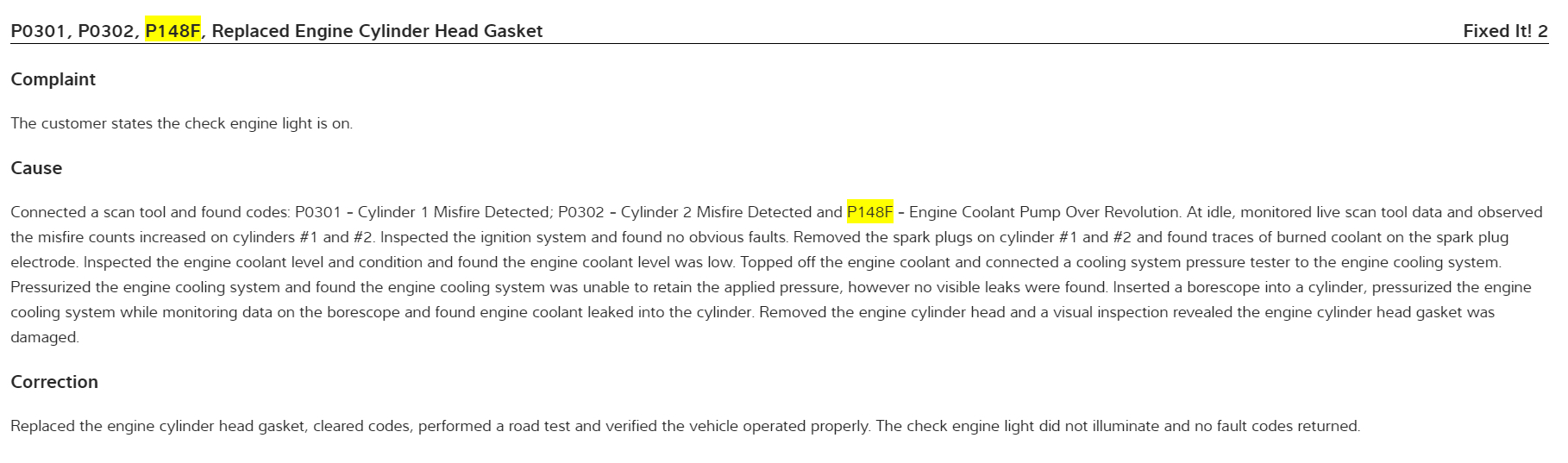 The p148f Problem Area is. 1. lack of engine coolant, 2. Engine coolant leak, 3. Engine water pump assembly.