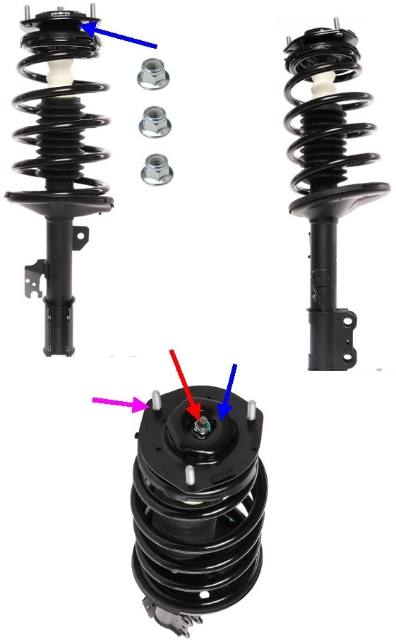 This photo shows what a Quick Strut for your van looks like. The blue arrows are pointing to the upper mount where the bearing assembly is inside. The purple arrow is pointing to one of the three mounting bolts you might be able to see under the hood, very near the hood hinges. The coil spring is held captive under pressure by the nut with the red arrow. Never loosen or remove that nut unless the coil spring is compressed with a special tool. If that nut is unscrewed, when it lets go, the spring can easily kill someone when it comes flying out.