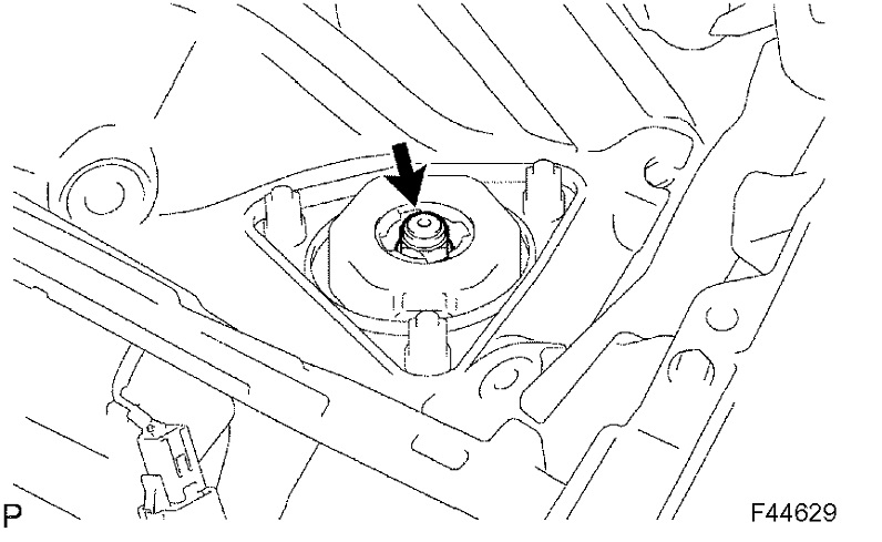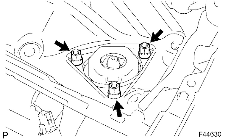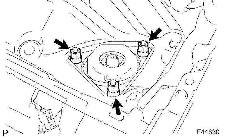 d. Remove the 3 nuts on the upper side of the front shock absorber with coil spring.