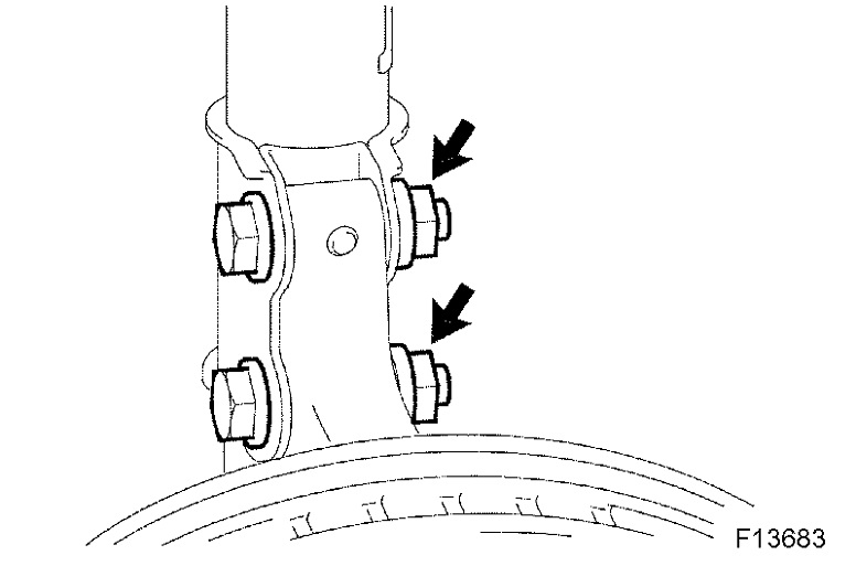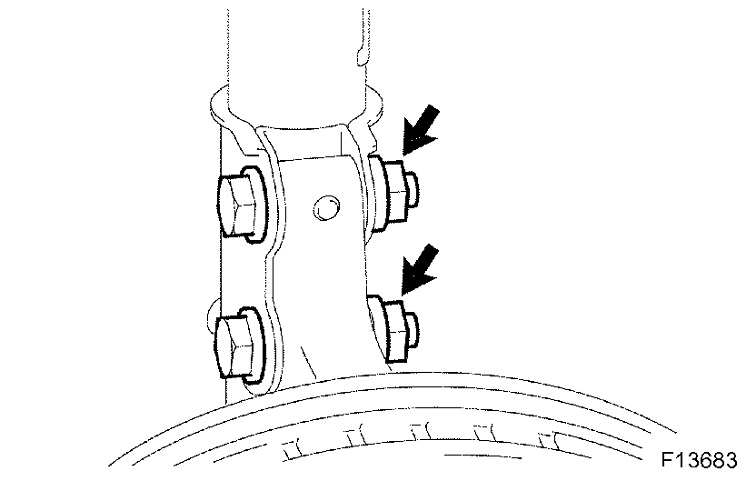 c. Install the 2 bolts and 2 nuts to the lower side of front shock absorber with coil spring.