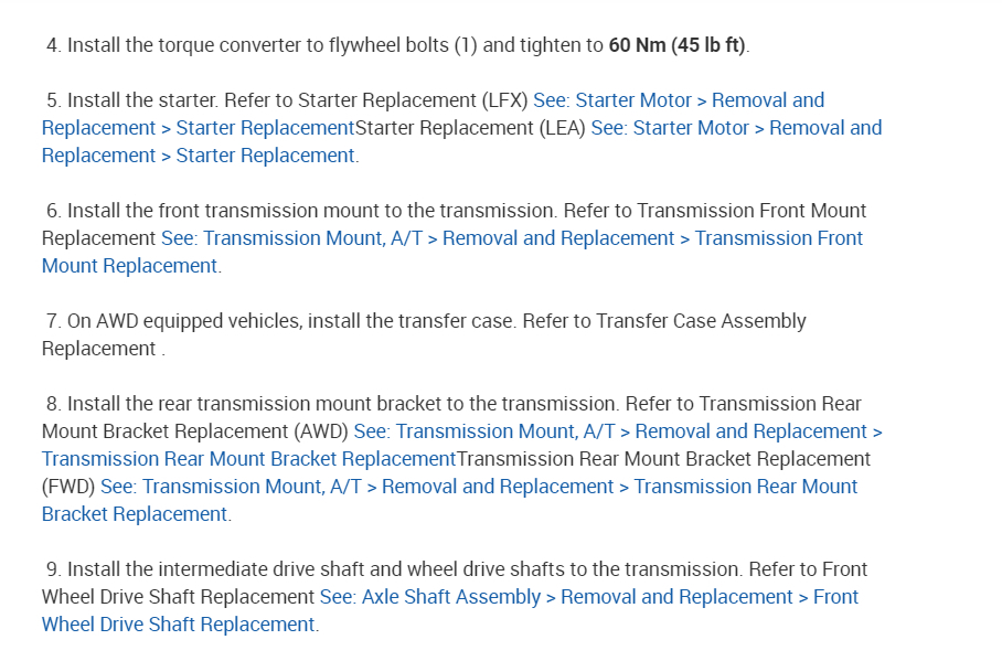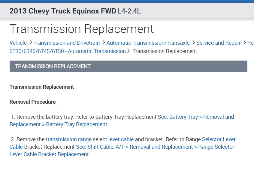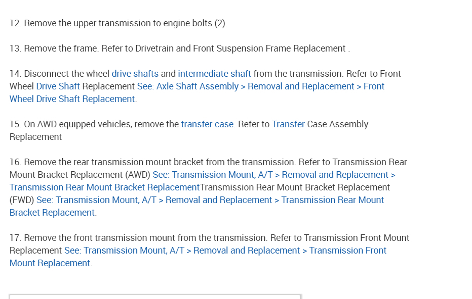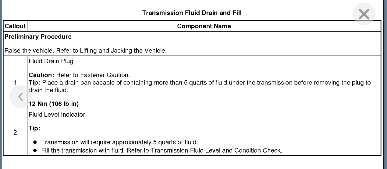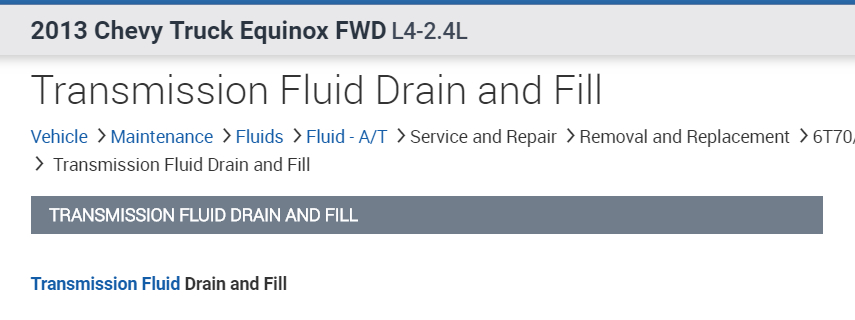 The vehicle specifications, or the transaxle chapter. I'm thinking it should be up by the front somewhere. You might be able to call the dealership and ask them. They should be able to tell from your vehicle's VIN#. I just want to make sure that I am getting you the correct information for your vehicle, that's why I need the information. There are 3 different transmission/transaxle possibilities for your vehicle.