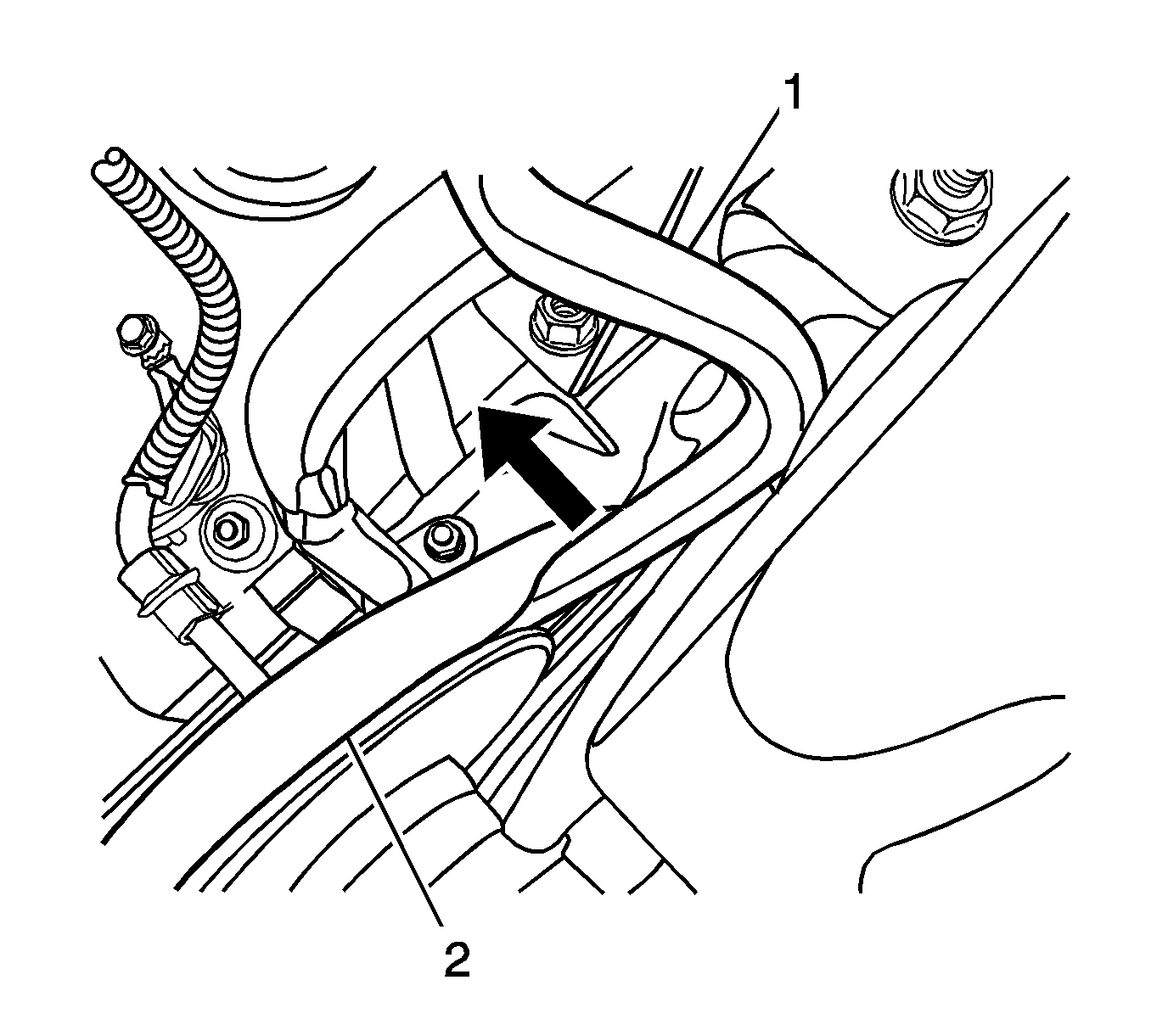 5. Using the bar (1) push the drive belt (2) into the opposite side of engine.