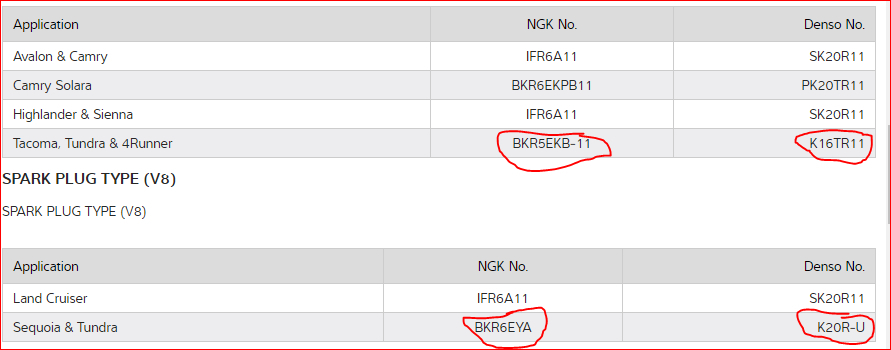 I have attached a picture and circled in red the NGK and Denso brand part numbers. The number on top is for a V6 and the bottom are for a V8 since you did not include your engine size. Hope this helps and thanks for using 2CarPros.