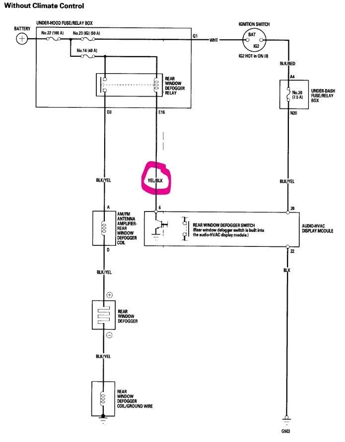 It looks like it would be a single wire Yellow with black stripe on pin 8. It gets grounded to turn the relay on for the defrost. The issue then is that the radio control switch does more than just turn it on. It also controls how long it is on and ensures it turns off with the key.