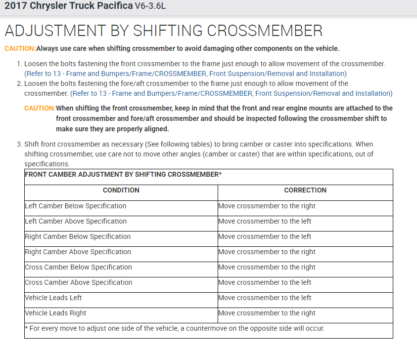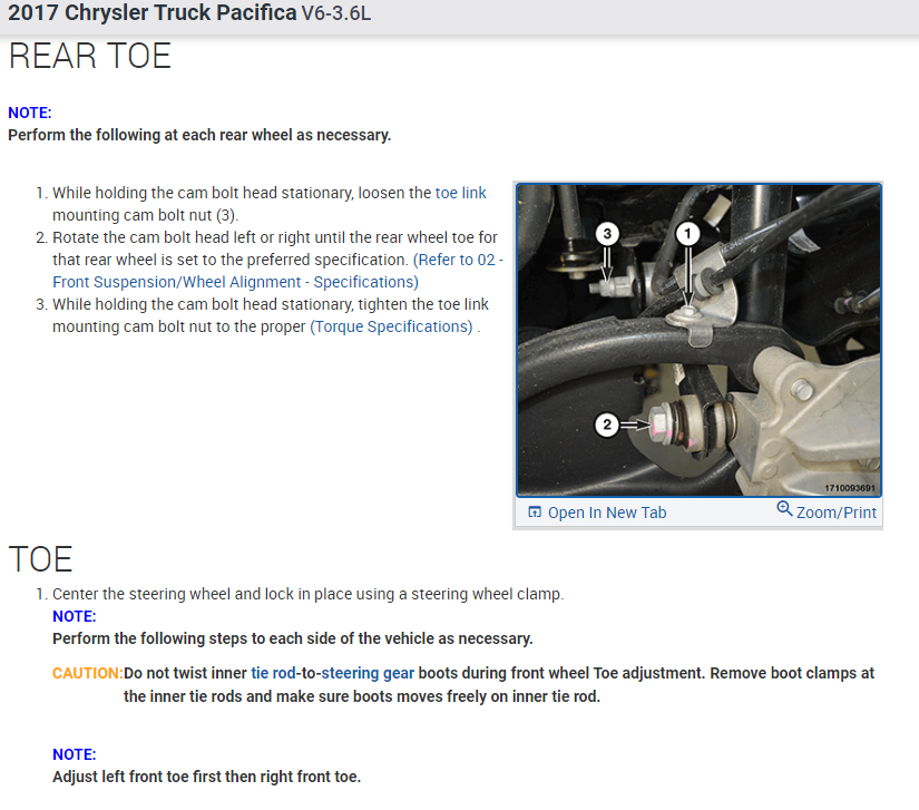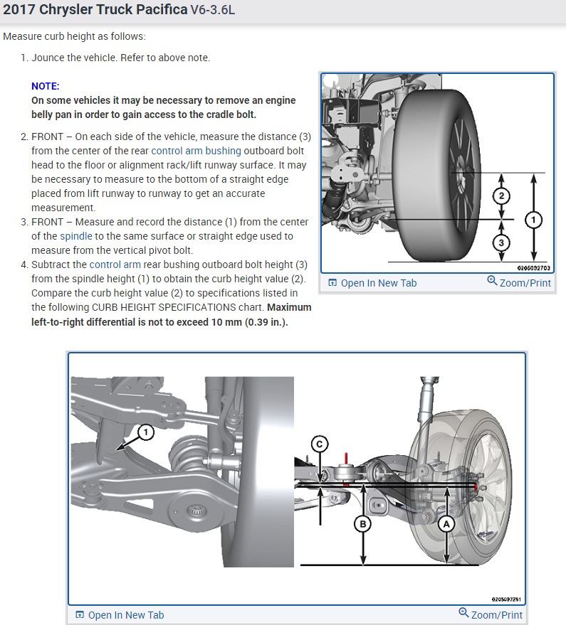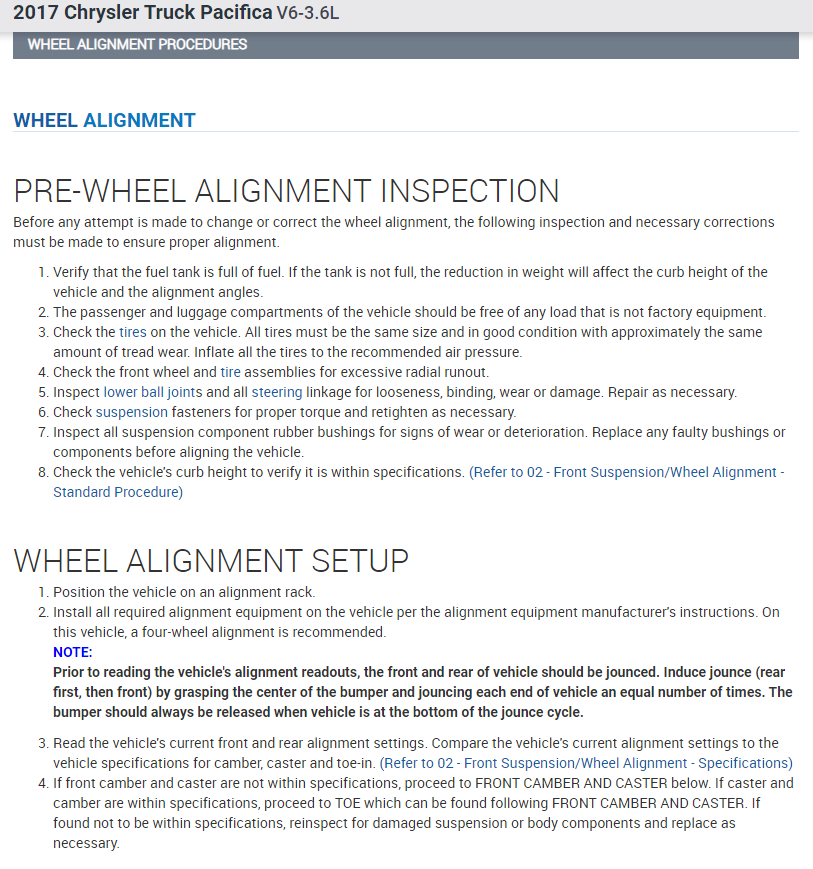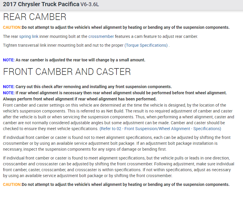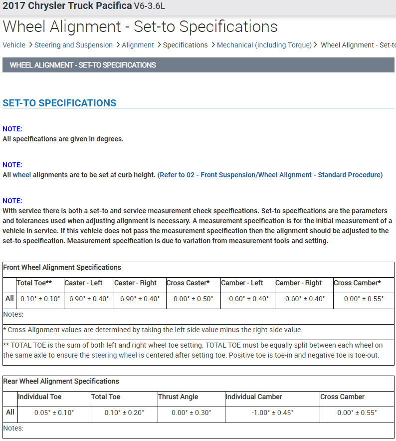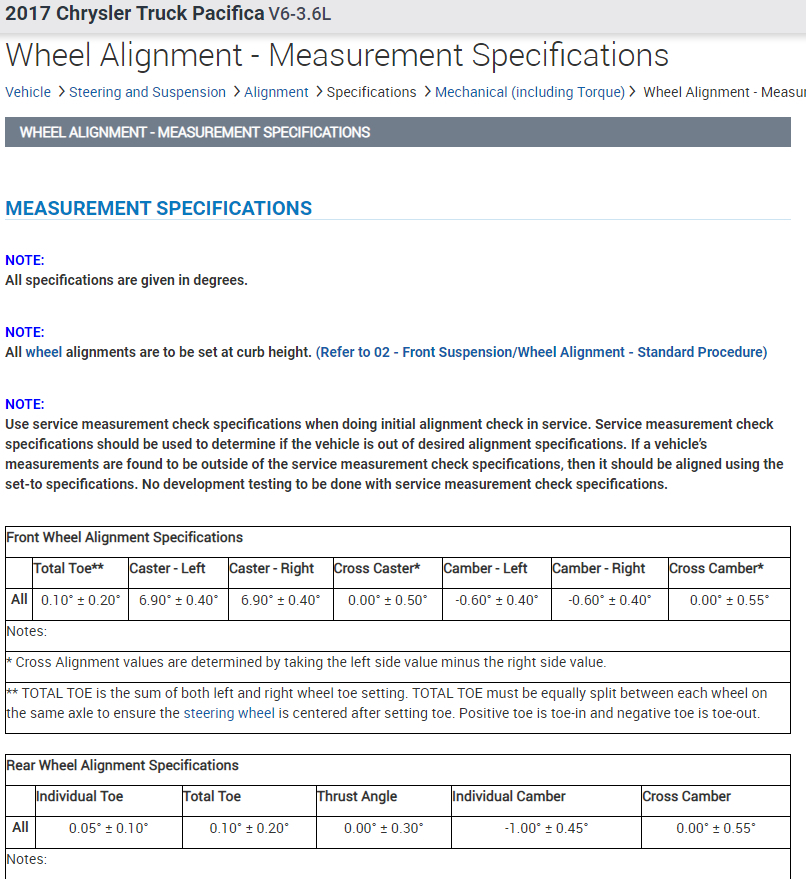 I went to my local wheel alignment service but the man didn't know technical data of pacifica 2017. It is the car from USA and he do not have this car in option car which can choose (I don't know how it explain in English). He need to know all technical data which relates to wheel alignment - degree, mm, Tilt angle, wheel alignment 0 or - or + (how many mm)... I don't know how it all name, but it should be data values from ... mm or degree to ... mm or degree.