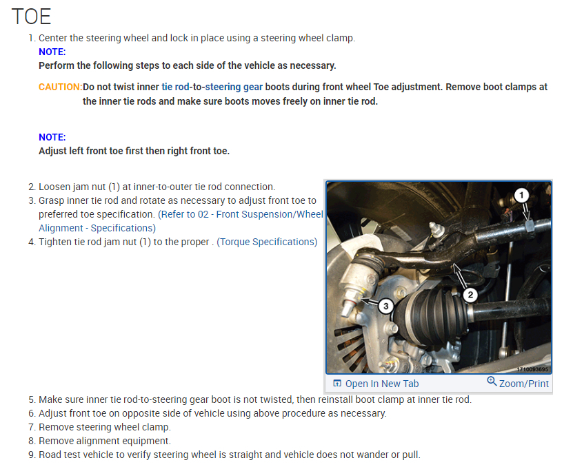 I have attached the alignment specifications as well as complete alignment procedures for your reference.