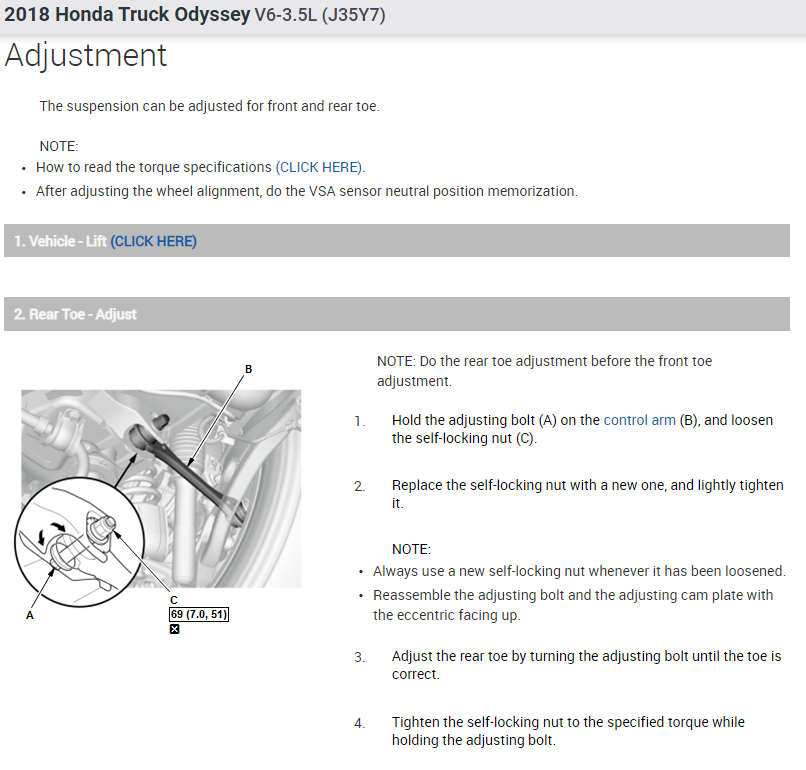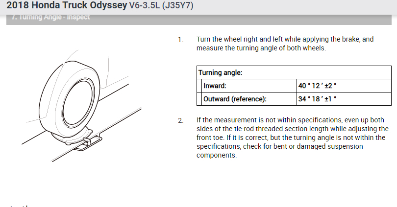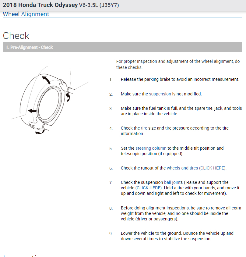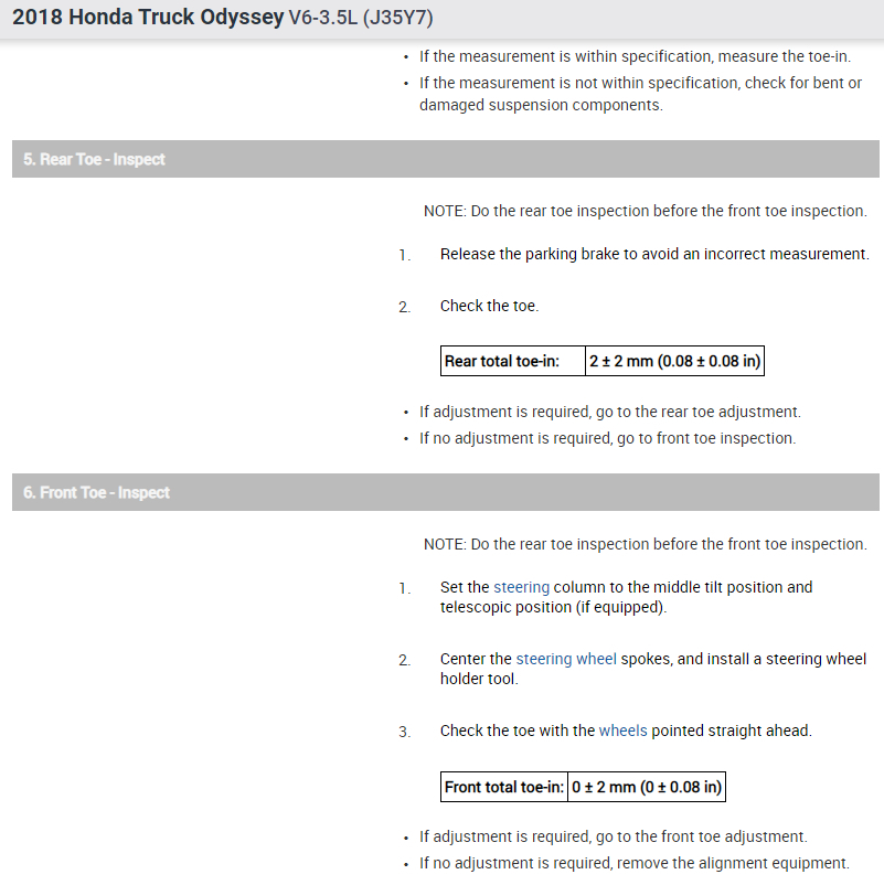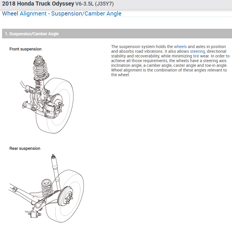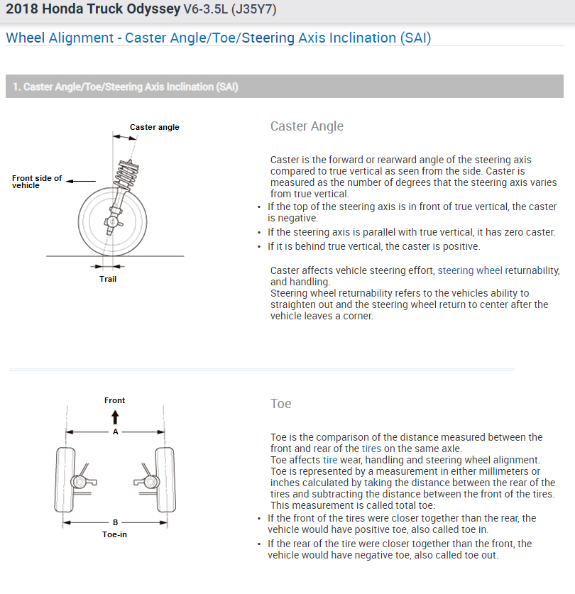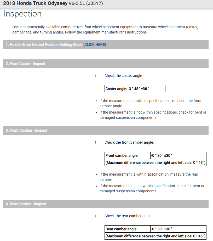 My brother bought the van listed above 2018/2019 3.6V6 EX-L after an accident. I need to know the alignment specifications as well as complete alignment procedures.