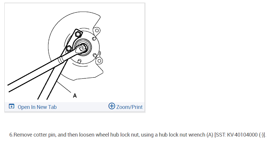 6.Remove cotter pin, and then loosen wheel hub lock nut, using a hub lock nut wrench (A) [SST: KV-40104000 (-)].