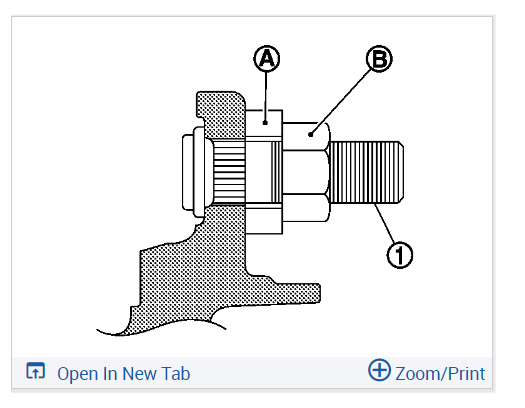 - Place a washer (A) as shown in the figure to install the hub bolts (1) by using the tightening force of the nut (B).