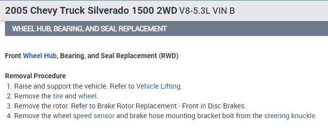 what is the procedure step by step for wheel bearing hub replacement on my 2001 chevy p/u 4wd.front driver side.its 4wd and its a sealed hub type?????????????????????????????????????????????????????????????????????????????????????????????????
