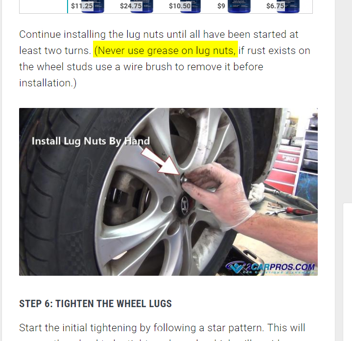 Also be aware to never ever use any type of anti-seize compound on the studs. That is serious enough that you might get one verbal warning, but at most shops you'll be fired instantly. I did allow my students to use that around the center hole since we're in a state where they throw a pound of salt on an ounce of snow, and rust is common, but never on the studs. Since you're a mechanic, you might appreciate my story from when I was the suspension and alignment specialist at a very nice family-owned Chrysler dealership. Since I was back-logged with other jobs, a coworker installed a pair of front struts on a Dodge Dynasty, and being the conscientious fellow he was, he coated everything with anti-seize compound to prevent a rust problem that never actually occurred. Unlike other Chrysler models that used "cam bolts" to make alignment adjustments easier, these just relied on the clamping forces of two really fat bolts to hold the wheel in alignment. They hold the wheel so well, hitting pot holes at high speed rarely causes them to slip. In this case, when he sent the car to me for the alignment, both front wheels had tipped in on top as far as they could go. I jacked it up, pulled the wheels out, tightened the bolts, let the car down on the tires, and the wheels immediately slipped again. That was frustrating enough but then the same thing happened a second time. The third time they slipped, I was frustrated with myself, thinking I wasn't tightening those bolts enough, I really cranked them down, so much so, that I snapped one of them apart right in the middle. I'm a little guy, but I pulled a bolt apart that was 3/4" in diameter, with a 1/2" ratchet. Once I took the wheel off to see what was going on, I found the anti-seize compound slobbered all over. That all had to be washed off for the alignment to hold. Even using axle grease doesn't result in that problem, so it shows how serious it would be to use it on wheel studs. No shop owner wants to risk the liability or lawsuits. That's why the offender usually gets invited to look for a job somewhere else.