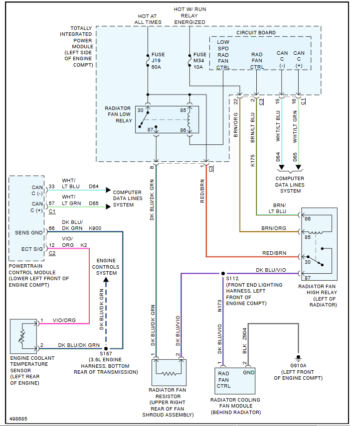 fan only runs when temperature sensor is unplugged. i am an electronic tech and may be able to repair module. if I can find it. Further info. I only have a cheap scanner. Fan and fuses all good. Relays in fuse box and the two by left headlight good. Traced all wires by color and verified live function of all relays. I found that the main fan relay did not have a change in control when a/c or sub relays switched. I checked fuses, relays, and fans both physically with meter and live. I just happened to see in a forum about the fan defaulting to on when signal lost from temperature sensor. I Unplugged -Bingo. One other thing. The outside temperature has been in the low 20's the past few days. Coolant temp shown in vehicle info screen on dash has been going to as low as 180 while driving and fluctuates with heat becoming less intense when coolant temp is low. Acts like thermostat sticking open. Just replaced thermostat - no change. No overheating. Fan is in-op for both cooling when coolant temp goes up and during a/c. Could faulty temp sensor readings but a culprit. I am capable of checking voltages if I had schematic and pinouts of PCM or fan control module.