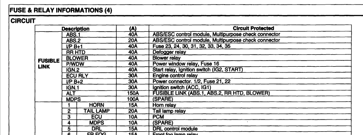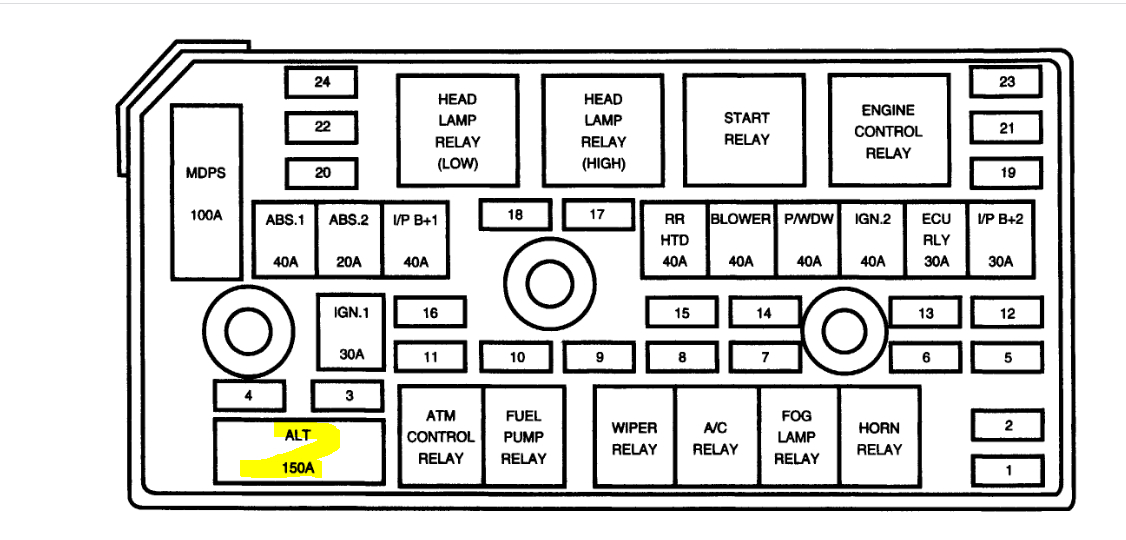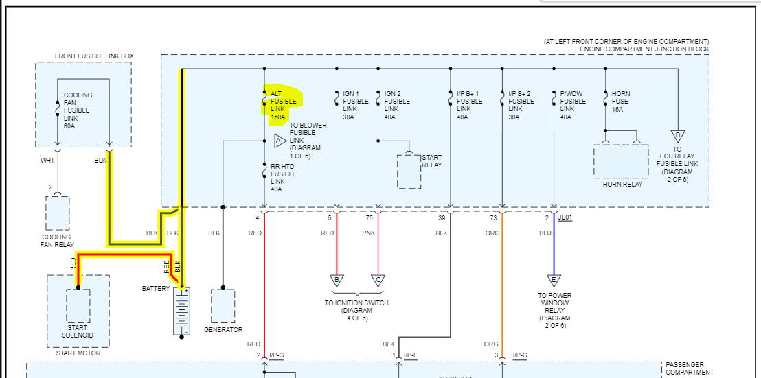 I went through the power distribution schematics and there is only one 150-amp fusible link. It is for the alternator and the ABS system and is located in the engine compartment junction box. See pics below.