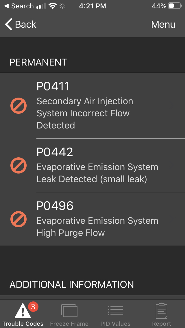 The screenshot shows the codes. I’ve already replaced the Canister Vent Valve Solenoid and Canister Purge Valve and it still cranks but won’t start.