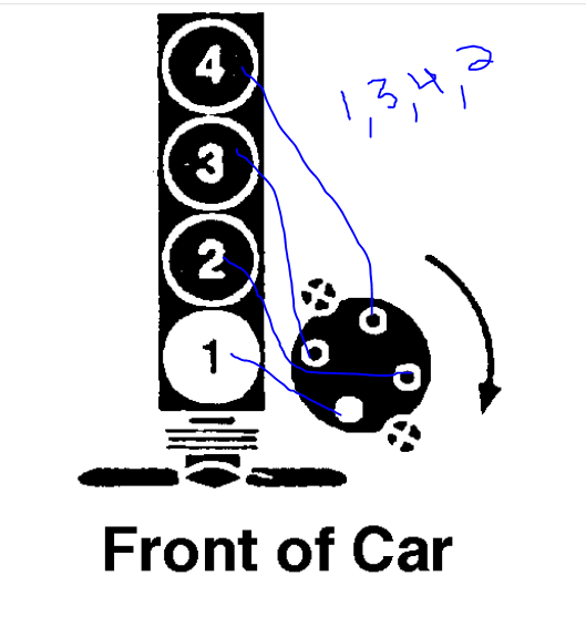You need the firing order. It is 1-3-4-2. I attached a pic below showing the distributor cap and cylinder locations. I drew a blue line from the distributor to the cylinder where it belongs.