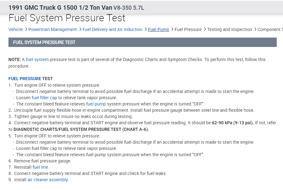 Also, here is a link that explains how to test fuel pressure. On this vehicle, you will need to place a T in the fuel supply hose under the hood and then attach a pressure gauge to that T.