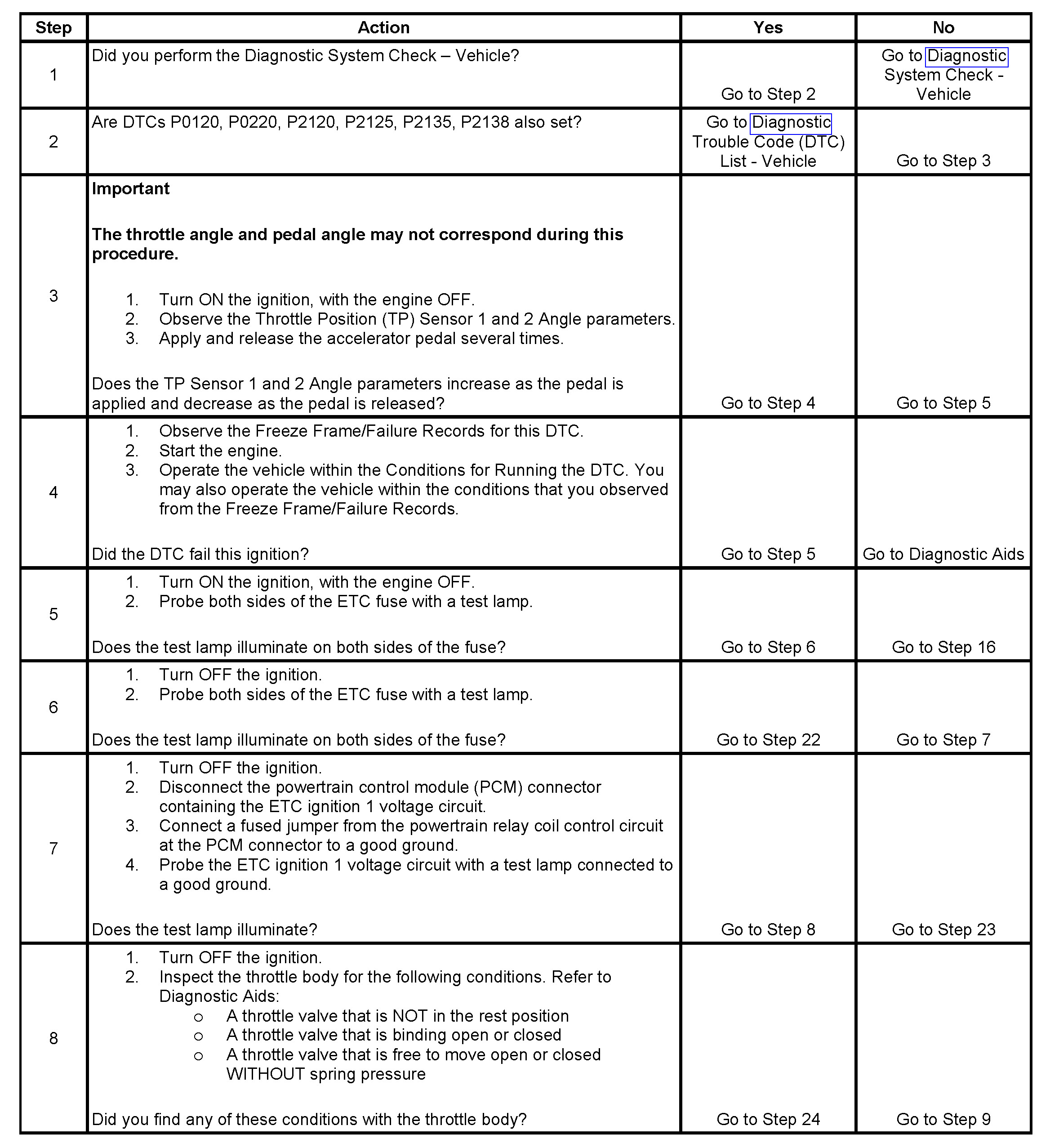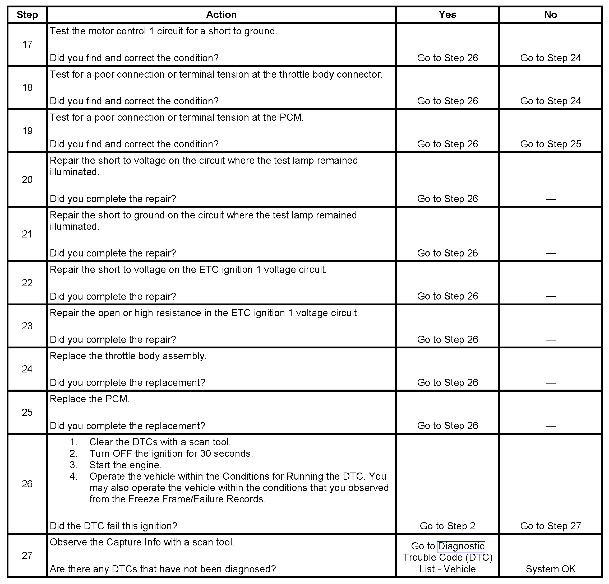 The commanded throttle position is compared to the actual throttle position based on accelerator pedal position (APP) and possibly other limiting factors. Both values should be within a calibrated range of each other. The powertrain control module (PCM) continuously monitors the commanded and actual throttle positions. This DTC sets if the values are greater than the calibrated range.