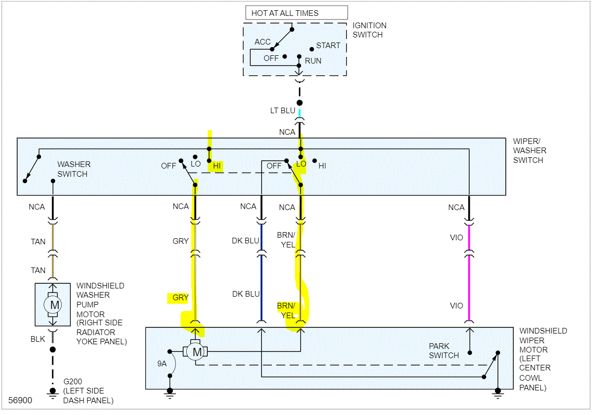 With the key in the run position, turn the wipers on low speed. Locate the brown wire with a yellow tracer and check if it has power. Next, turn the switch on high speed and check the gray wire at the wiper motor for power.