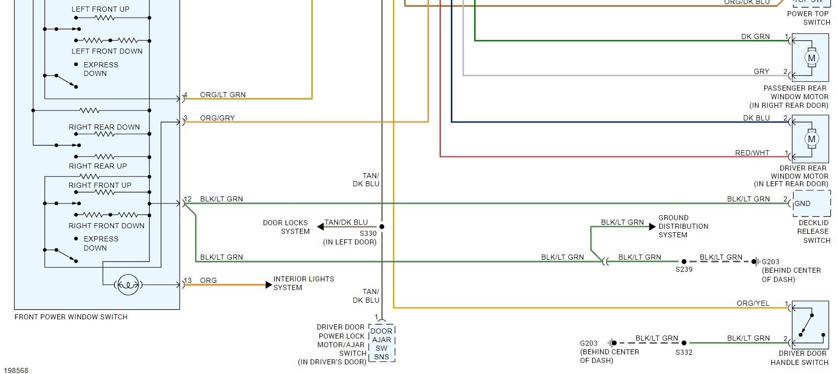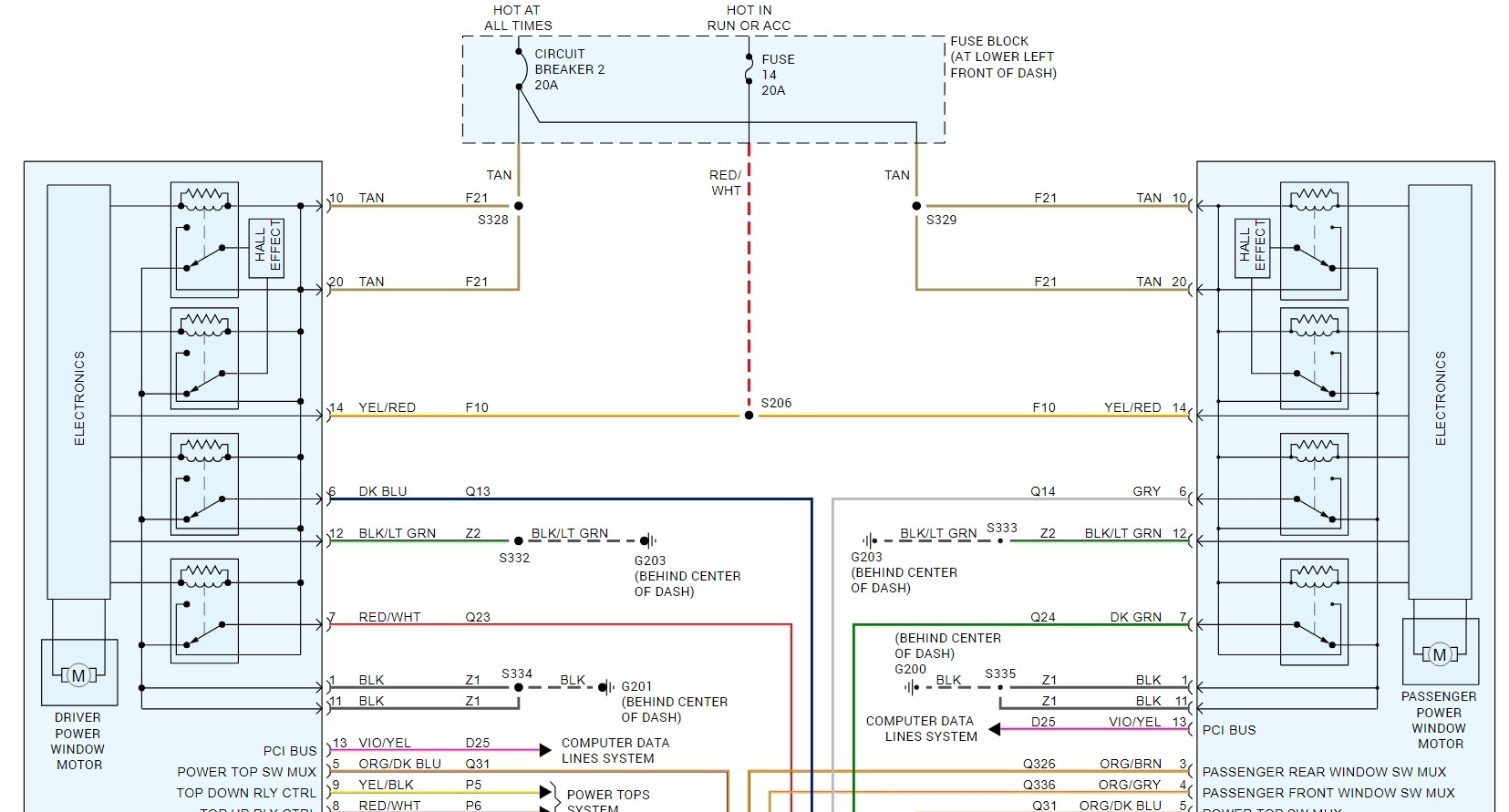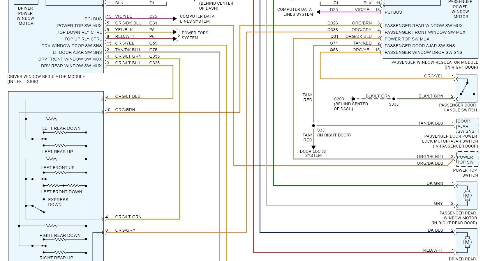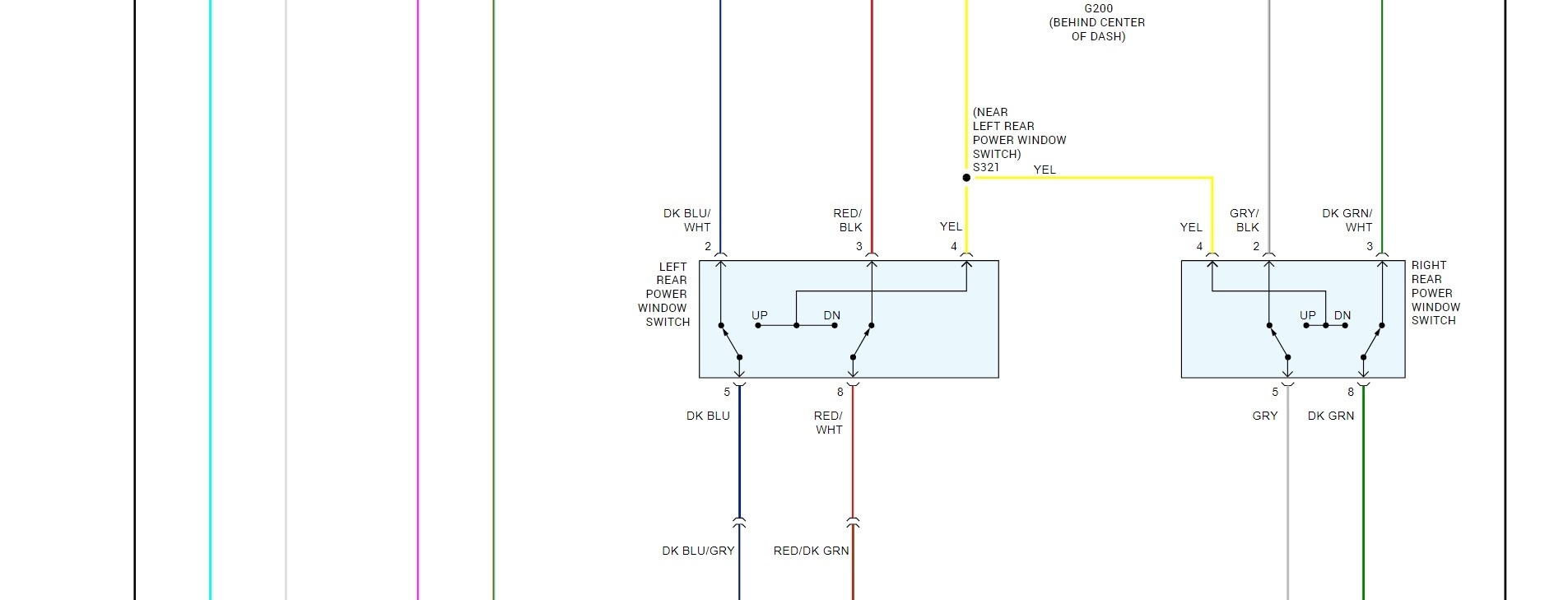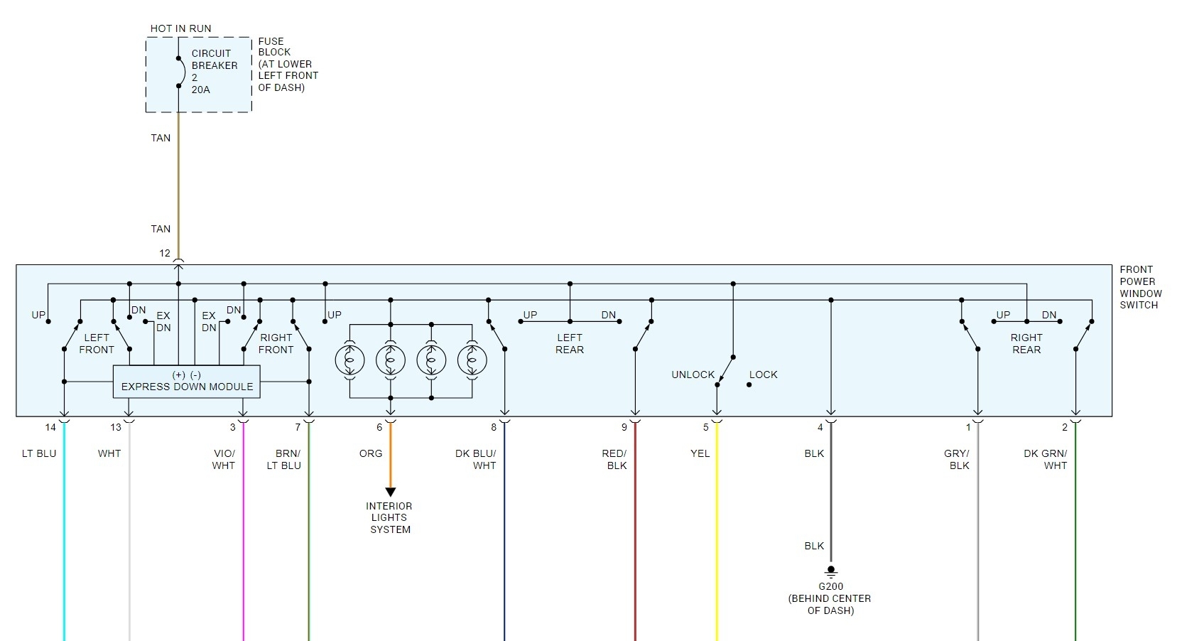 Replaced switches and jumped off battery. Windows still do not function. Doors will unlock with a button but no sound when attempting to lock from the switch. Circuit breaker CB2 is closed. I need to know where to test to see where I'm losing voltage. Or I need a good, clear schematic.