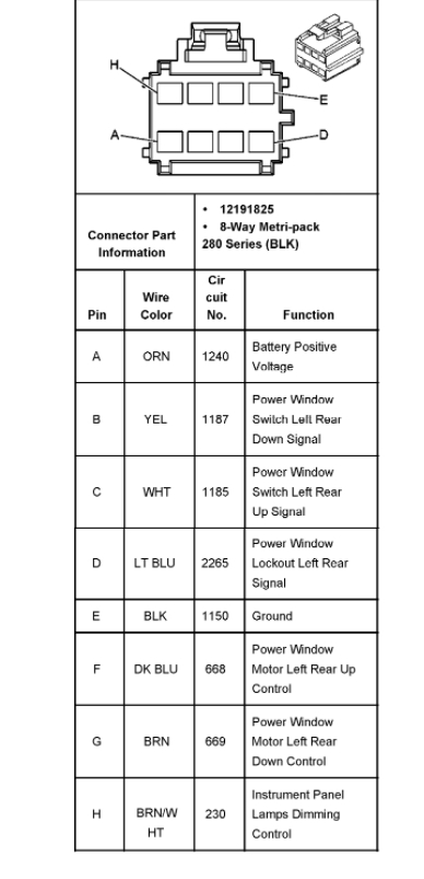 window on drivers' side will not work, i have replaced it two times still won't go up! i need wiring diagram and info on which color each wire represents.