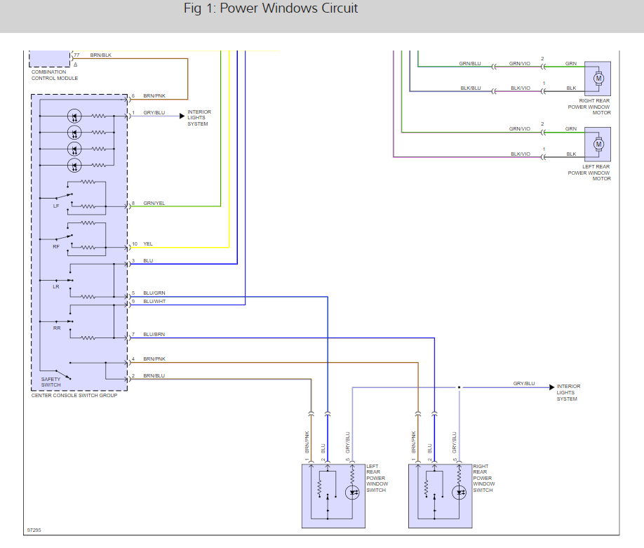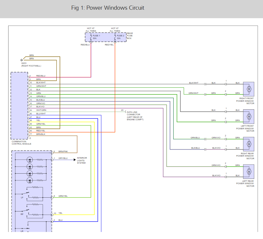 There are two fuses #1 and #2 in the rear fuse panel that need to be checked. Here are the window wiring diagrams so you can see how the system works and a guide to help you check for power at the fuse: