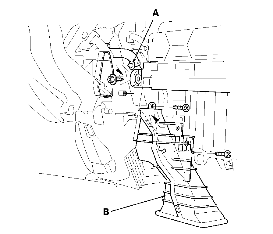 2. Remove the wire harness clip (A), the self-tapping screws, and the passenger's heater duct (B).