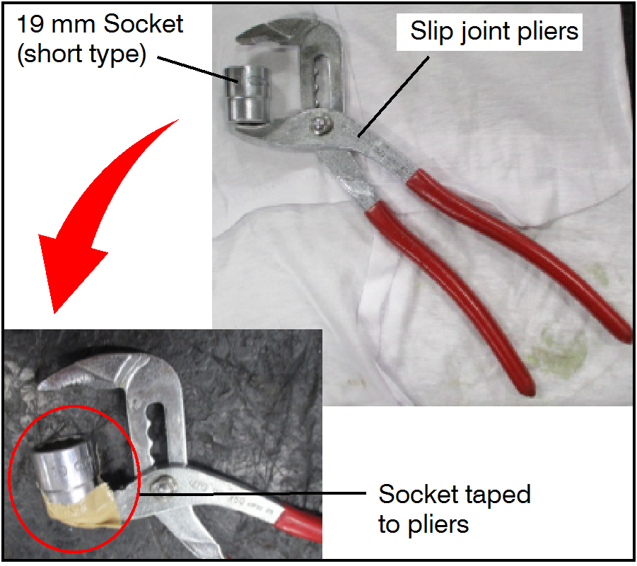To prevent damage to the plastic case, improvise a tool using a 19 mm socket taped to slip joint pliers as shown.
