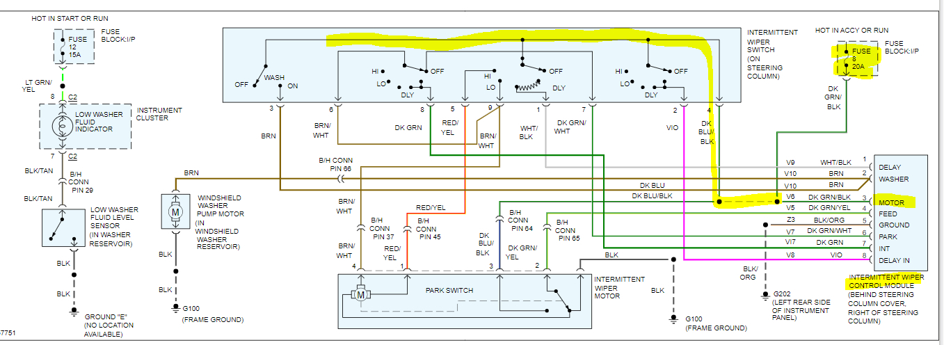 The vehicle doesn't have a wiper relay. For both low and high speeds, power is direct from the switch. The delay function is controlled by the intermittent wiper control module.