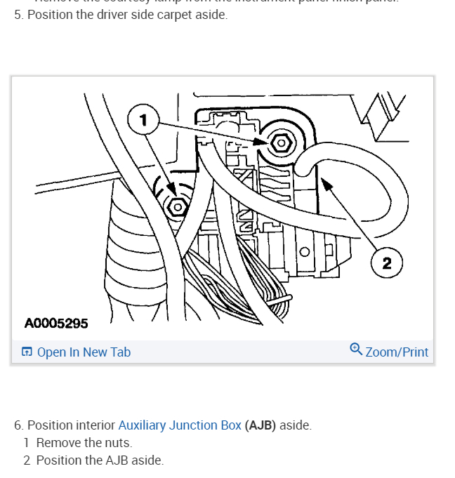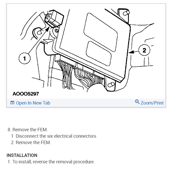 Disconnect negative battery cable. Remove driver's side scuff plate. Remove driver's side kick panel. Remove instrument panel lower cover. Move carpet to access interior auxiliary junction box. Remove nuts and position interior auxiliary junction box for clearance to FEM. Remove bolts and FEM. Remove 6 FEM harness connectors. To install, reverse removal procedure.