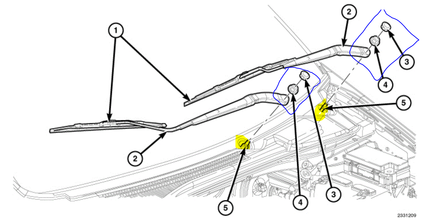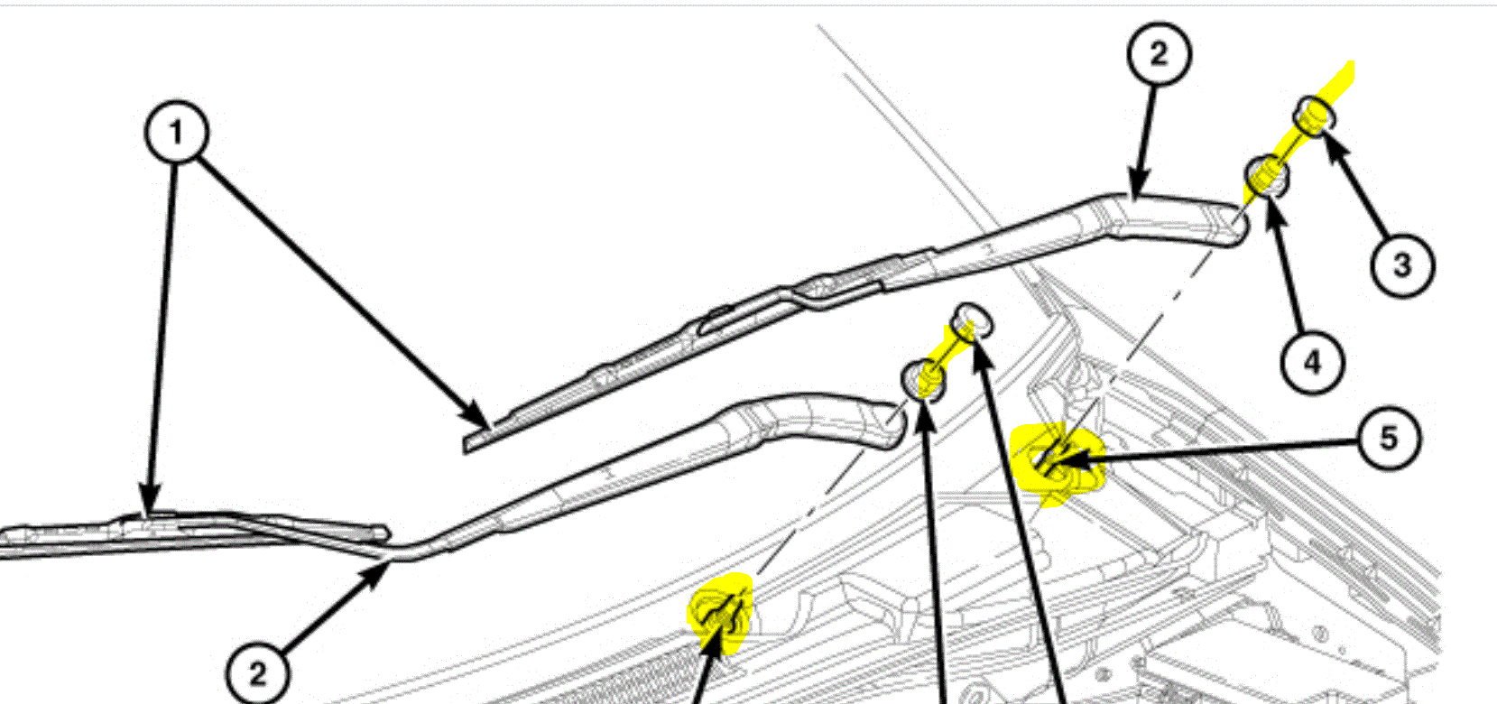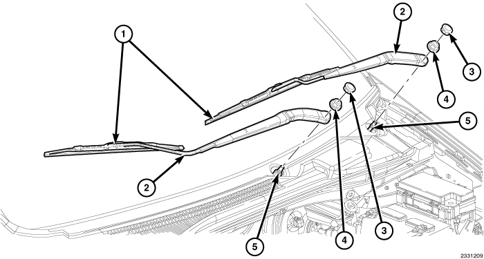 The front wiper arms (2) must be indexed to the pivot shafts (5) with the front wiper motor in the park position to be properly installed. Position the wiper arm pivot end onto the wiper pivot shaft so that the lower edge of the wiper blade (1) is aligned with the wiper alignment lines, which are horizontal T marks concealed in the upper margin of the lower windshield blackout area.