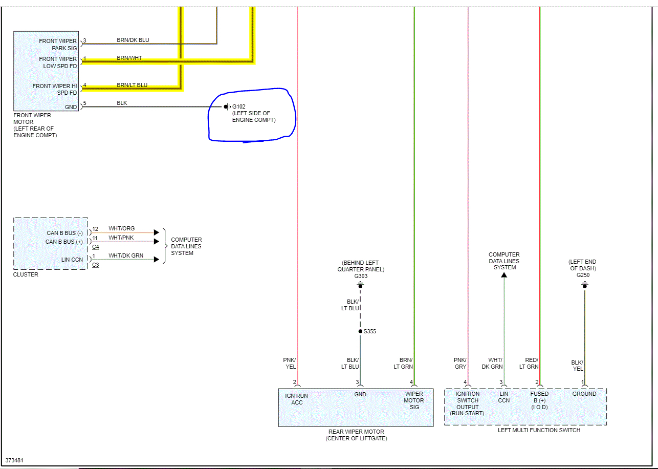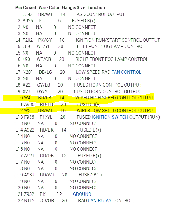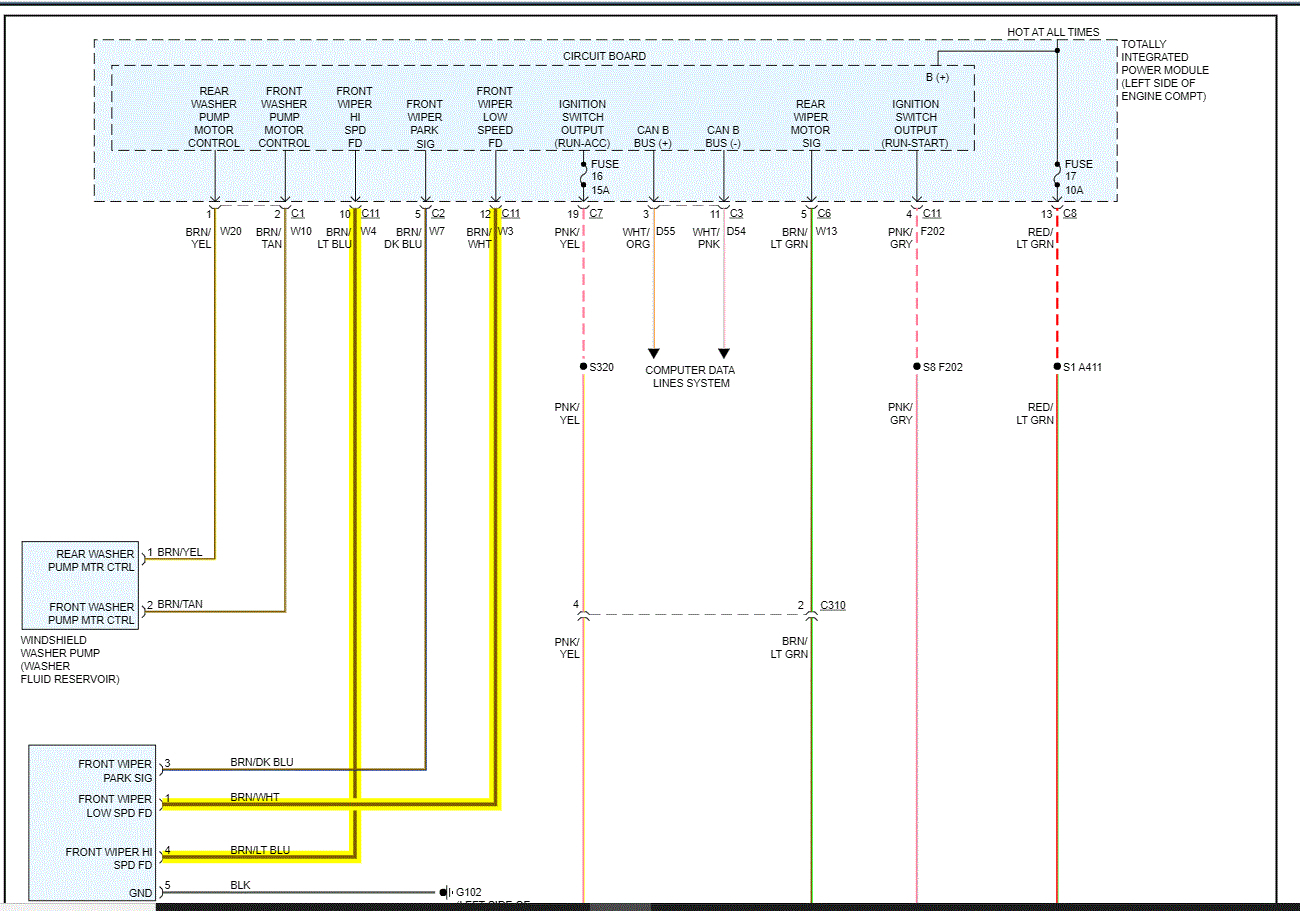 If that checks good, then we need to confirm if there is power to the motor. If you look at the wiring schematics below (pics 2 and 3), notice I highlighted two wires. One is brown with a white tracer and the other is brown with a light blue tracer. The brown/white powers the low wiper speed and the brown/lt blue powers high speed.