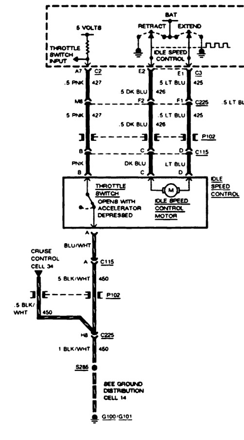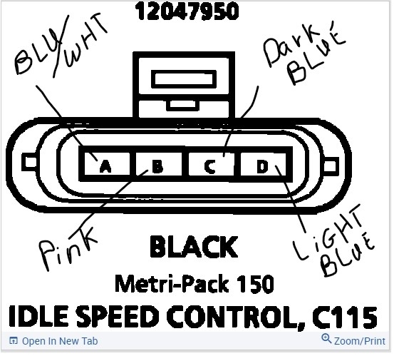 The IAC has a 4-pin connector with a pink wire (5-volt bias), a light blue wire (motor), a blue wire with white stripe (ground) and a dark blue wire (motor). The connector view is looking at the front face of the connector on the wire.
