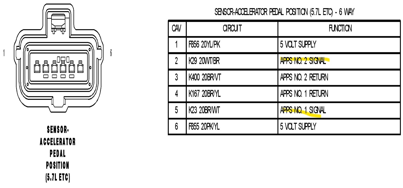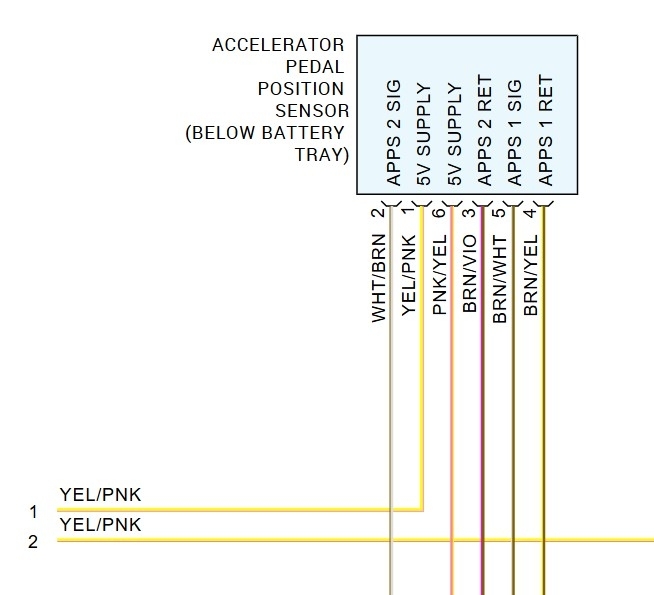 The APP sensor is listed to be under the battery on the aftermarket wiring diagram, which is not correct. It is on the pedal, But with the Key On, engine off, there should be two wires with 5volts on them, two wires which are Grounds for the sensor, and if you back probe the signal wires while the connector is still plugged in, checking one signal at a time, you should see the voltage fluctuate from 0volts to roughly 5volts when you press the gas pedal down, usually it's not all the way to 5volts, some only go to 3volts, some 4.5volts, etc., but it should change with pedal movement, You can use the sensors Grounds (APPS RETURN) or Battery Negative when testing with a multimeter, I would check using both ground locations to see if that's possibly the issue.
