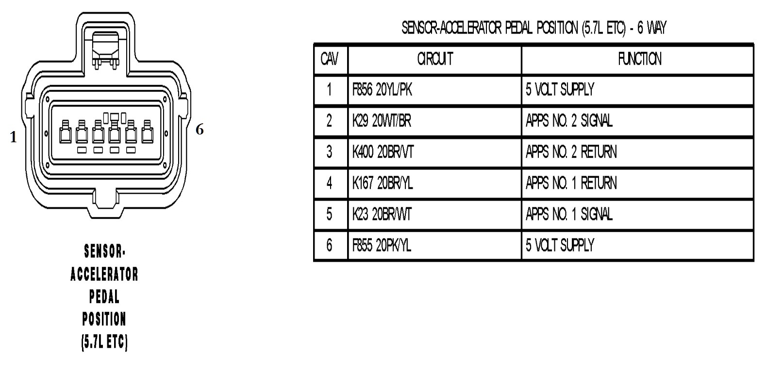 Here's the Accelerator Pedal Position sensor wiring and connector pinout.