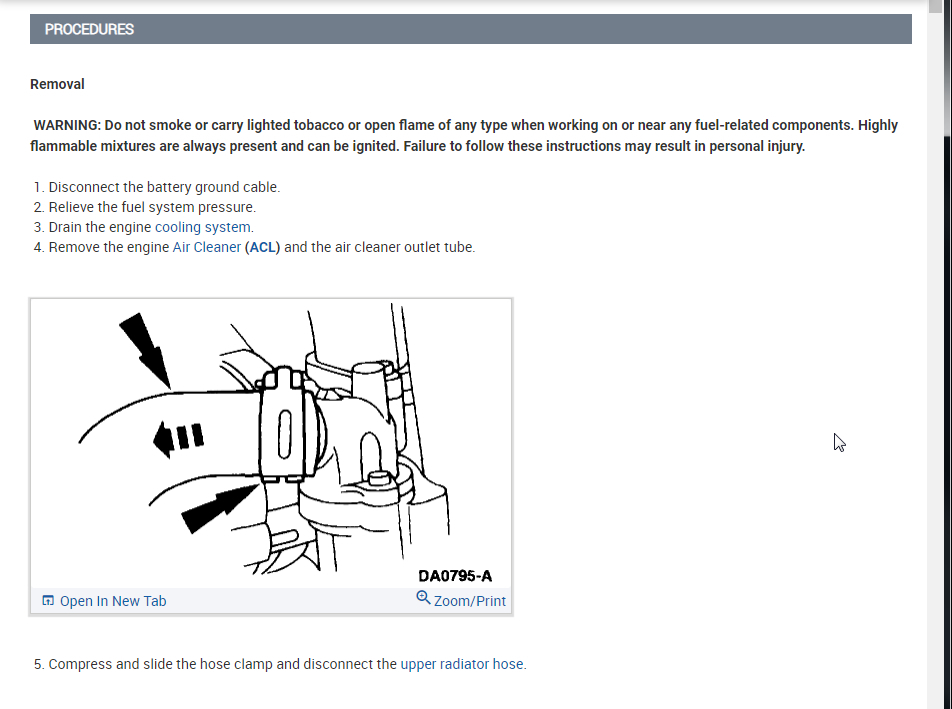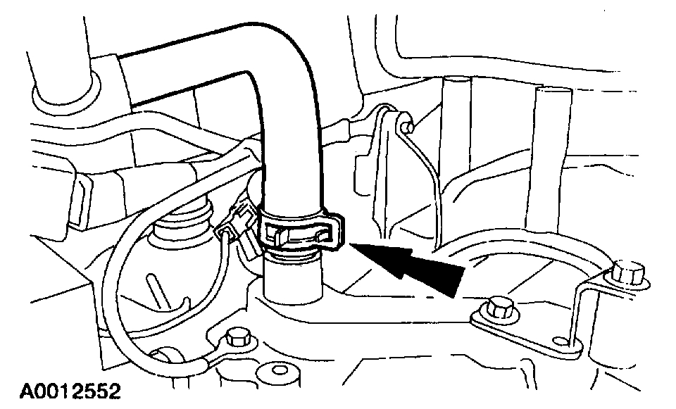 5. Compress and slide the hose clamp and disconnect the upper radiator hose.