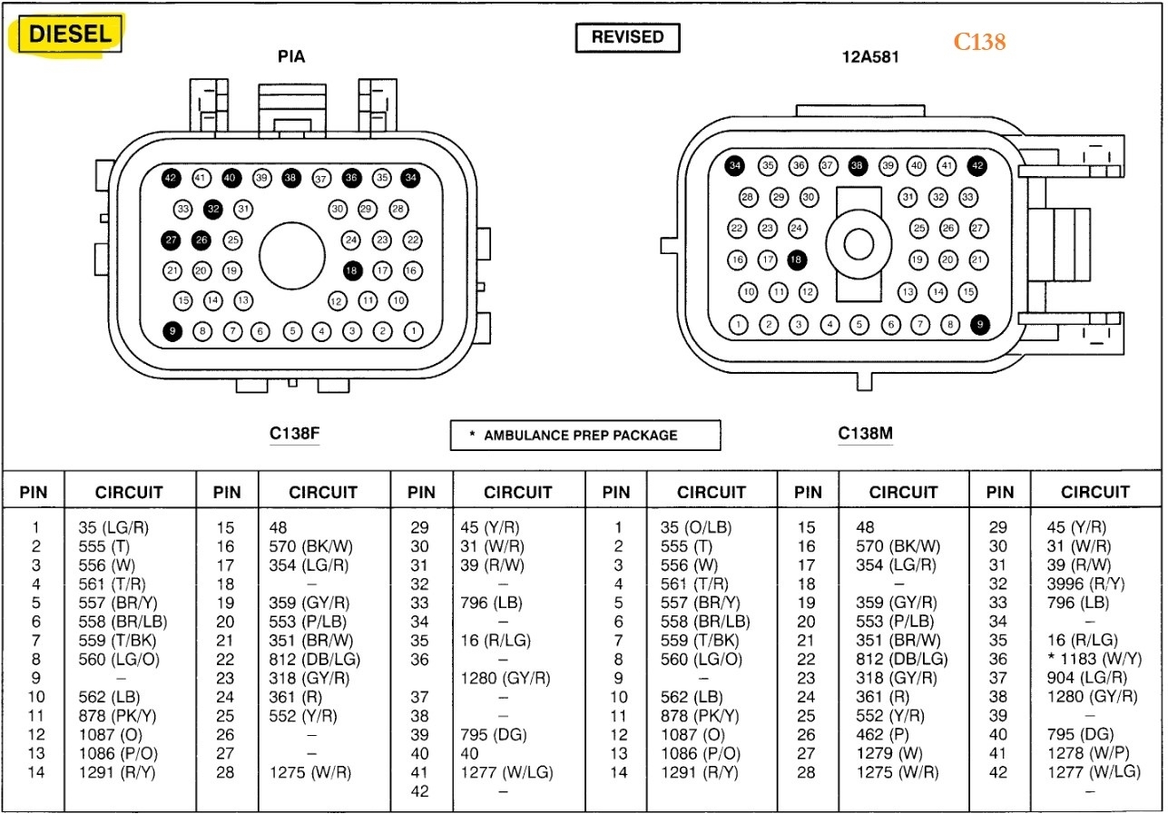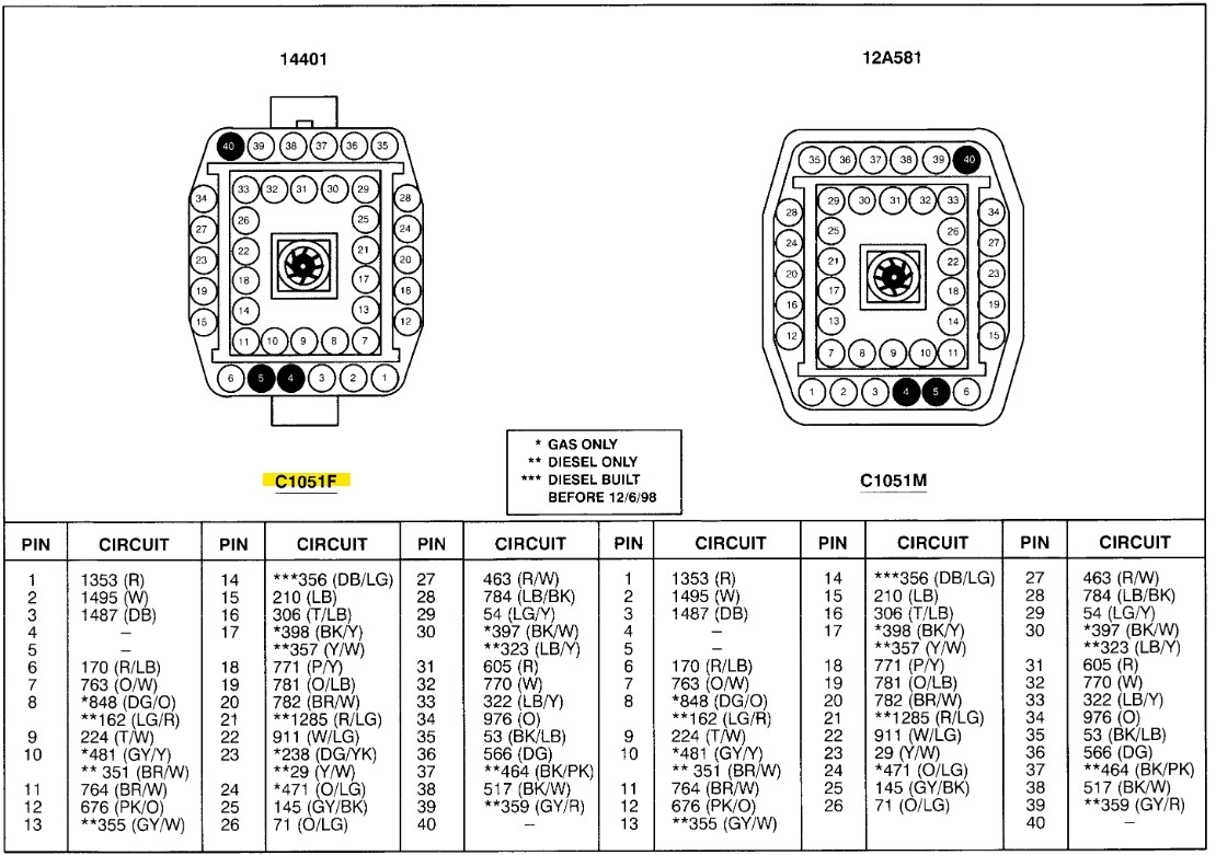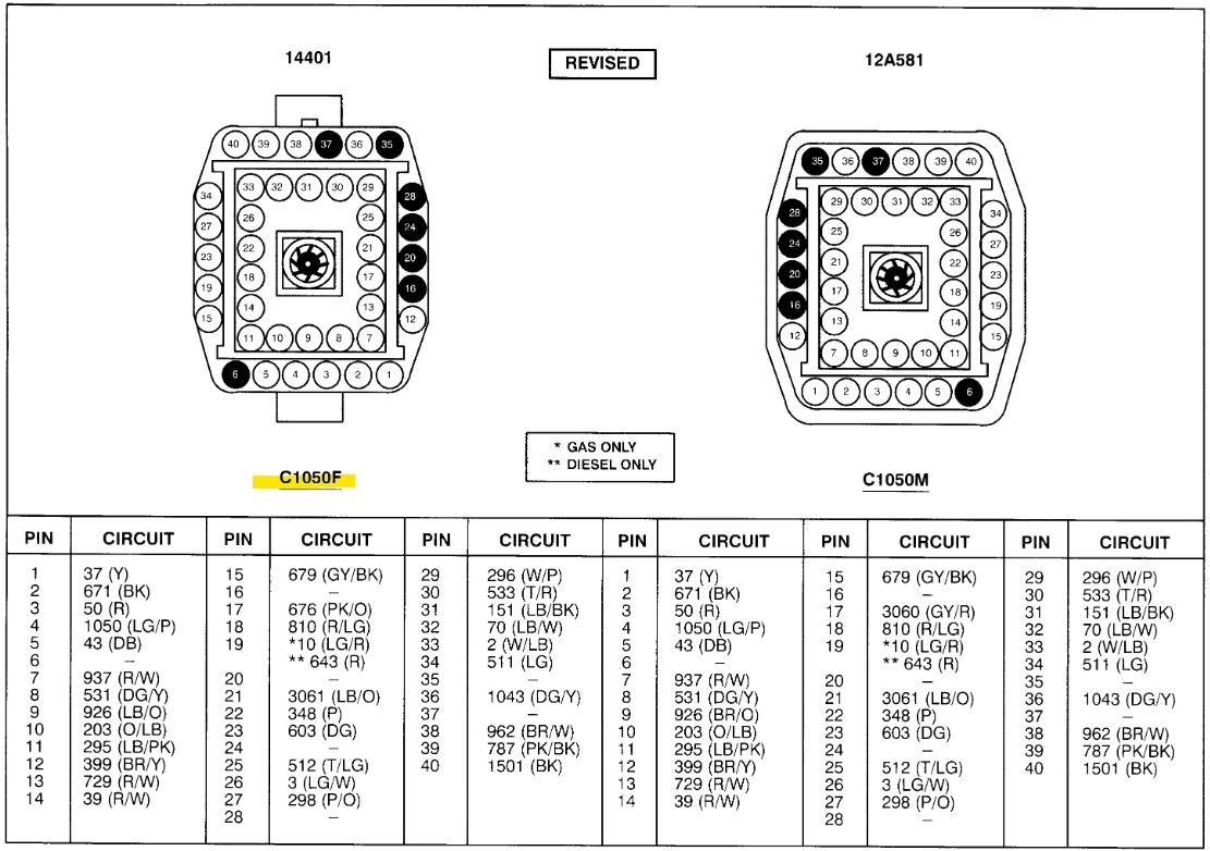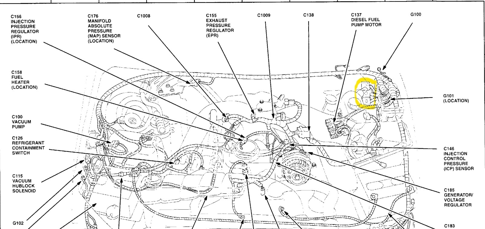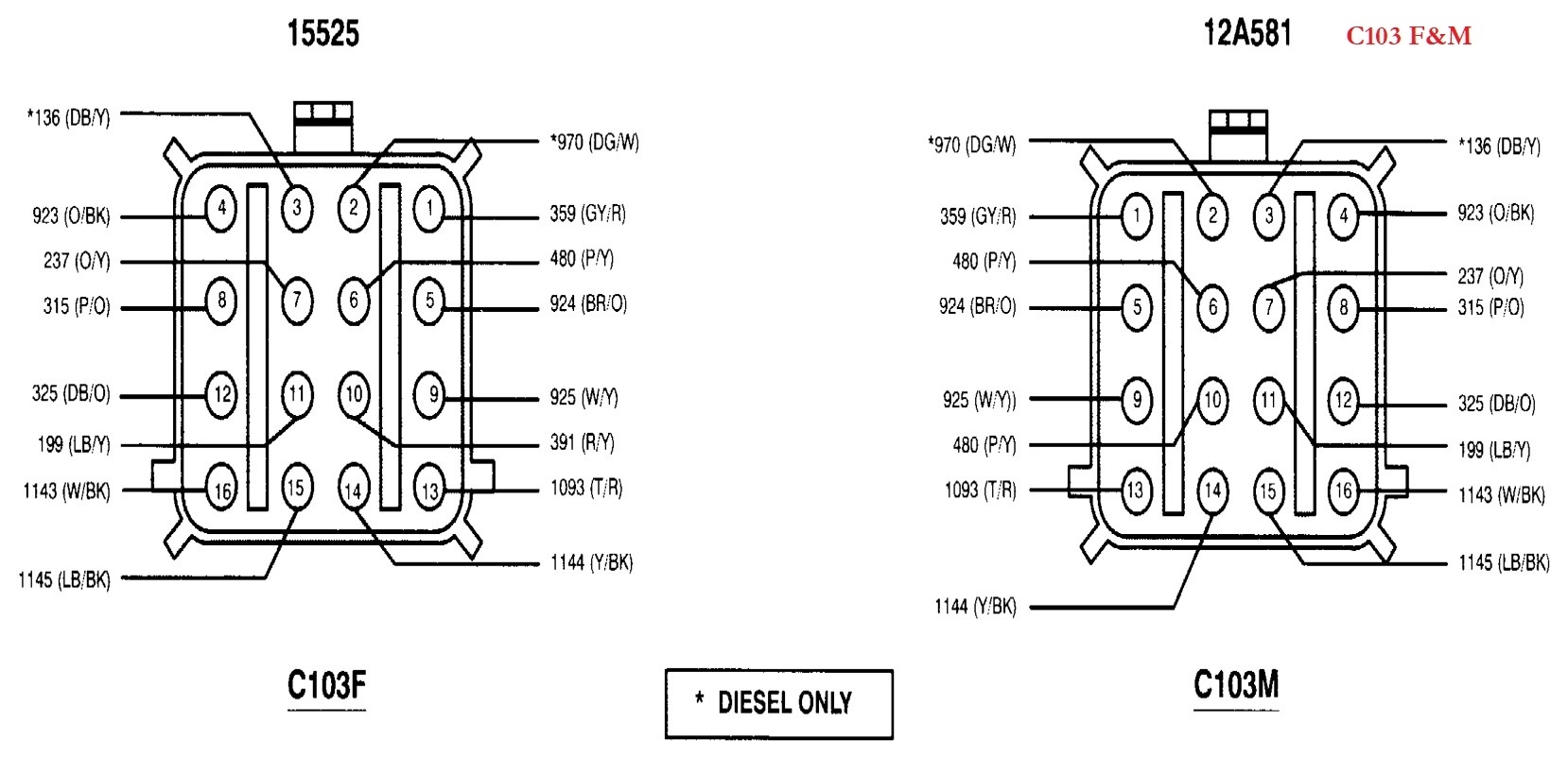 Looking for a pin diagram explaining what the wires are for on a 99 F250 7.3 diesel. Plug in question is the bottom large grey plug on the drivers side. Plug connects on the firewall and goes out to engine bay.