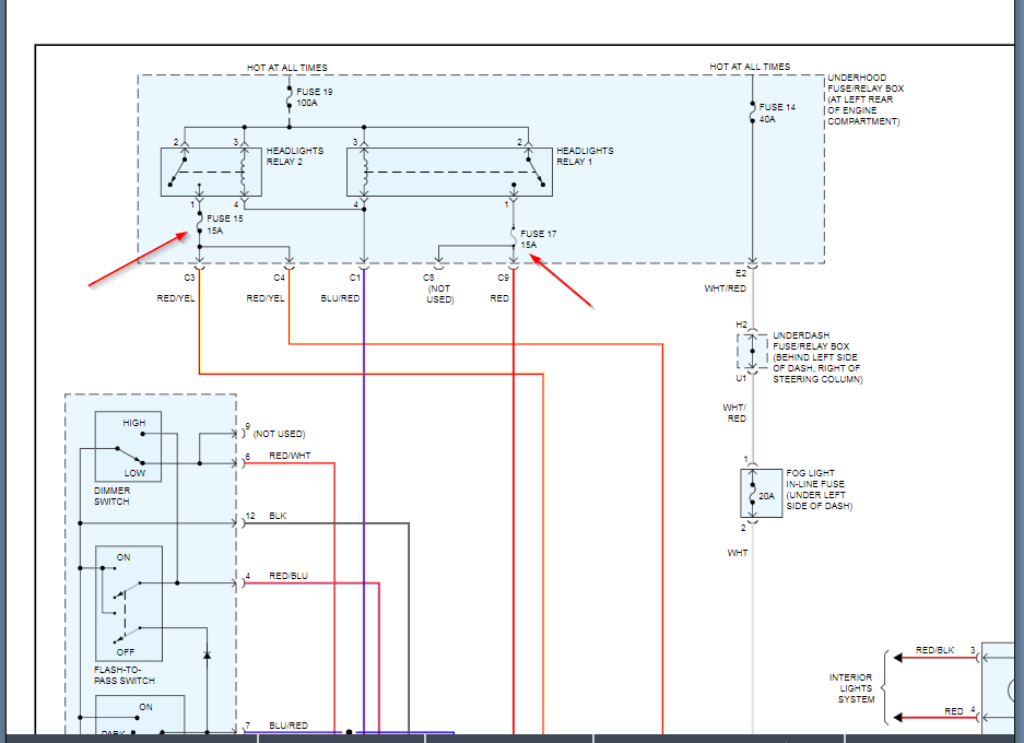 I would suggest using a fuse tap pictured below. Just replace one of the fuses that I point to in the diagram with this fuse tap and then install that same fuse (if a replacement of the same size is not provided) and then use the pigtails to wire in your switch. At this point your switch will be active with the lights are on as you wanted.