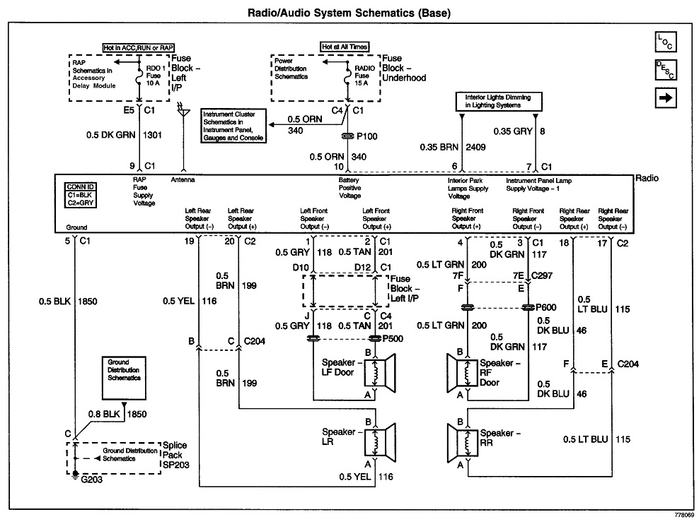 If everything still works with the radio not installed, this diagram is for the base model. Per their standardized wiring color codes, the orange wire is hot all the time. That's for the station presets and clock memory. The dark green wire is the switched 12 volts from the ignition switch.