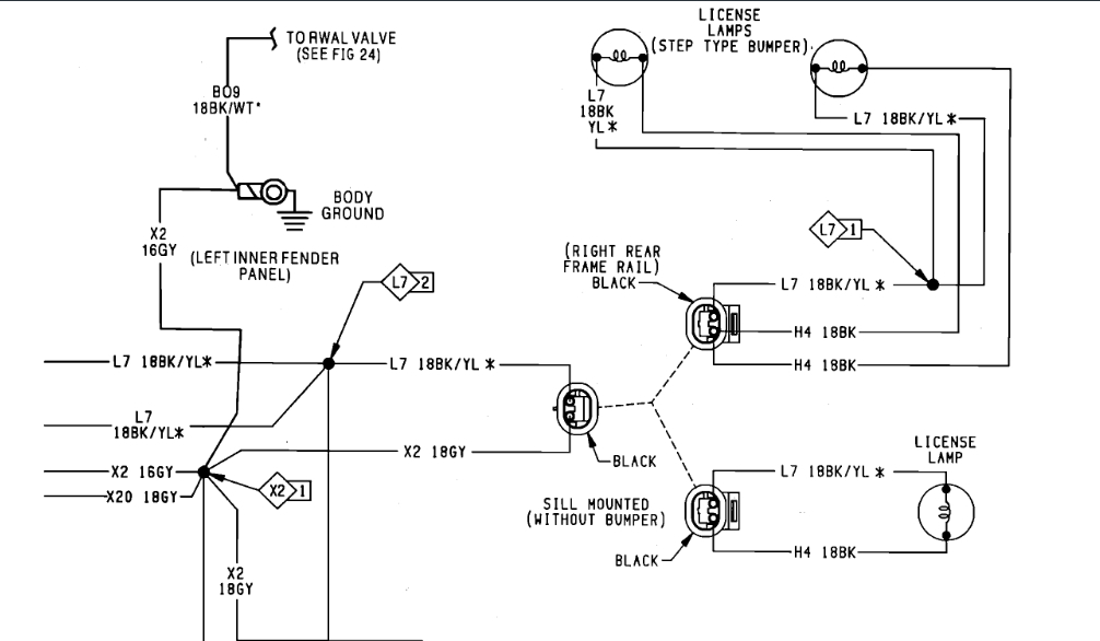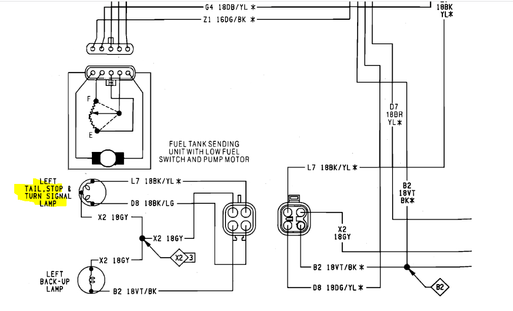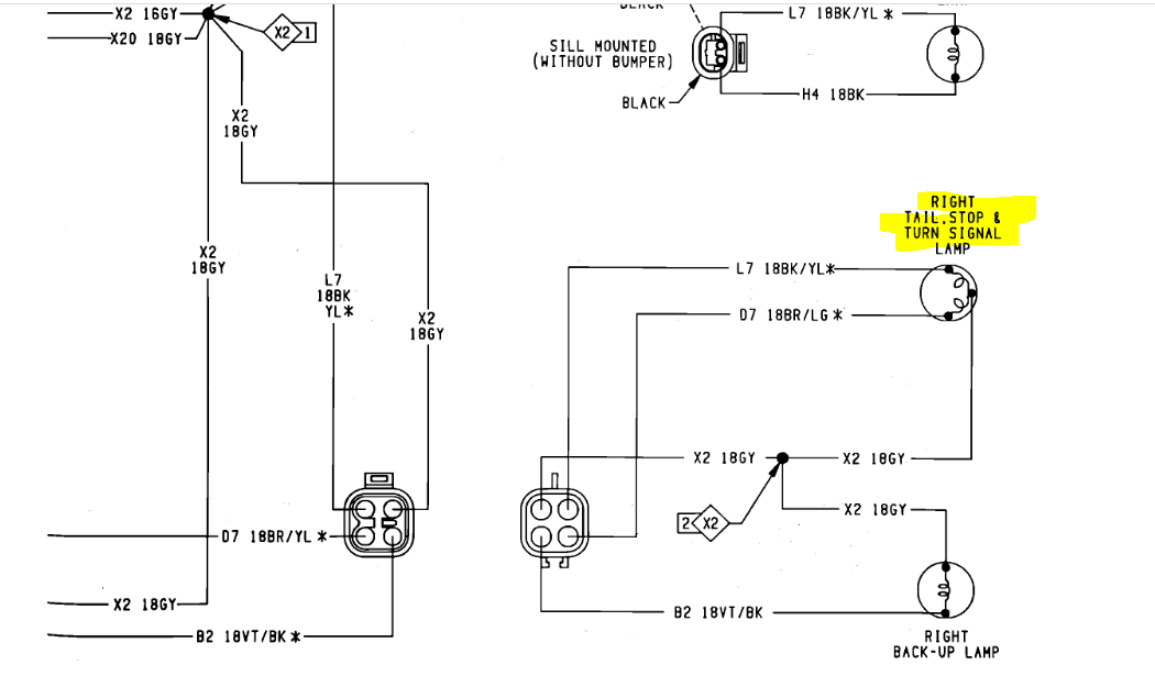 See pics below. Note: the schematic was two pages. I had to cut them in half to make them readable for you. I did overlap them so you can follow from one to the next. Also, the first two pics are the left taillights and pics 3 and 4 are the right side.