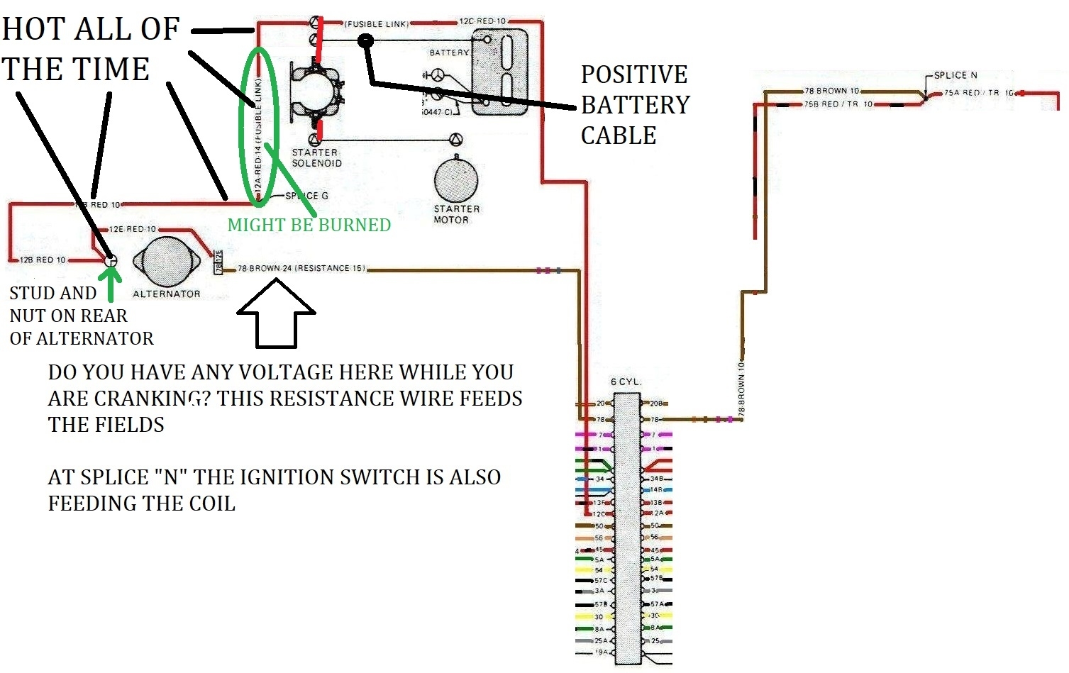 On CJ's first diagram, the fuse link wire is way at the top, right under the digit, "3". In his later post, it is drawn differently, but he has it circled. When you have an aftermarket wiring harness, or any other non-standard part, there's no way for us to know what someone else did, so we can only tell you what we know relative to standard parts. In this case, you have a GM charging system, and a Ford starting system. Ford uses the large "Battery" terminal on the starter solenoid as their convenient tie point. This is a good place for someone to make a mistake and connect the generator's wire to the wrong large stud. If that was done, you would find 12 volts on the generator's output stud only while you were cranking the engine. A better guess is that wire got overlooked and is not connected.