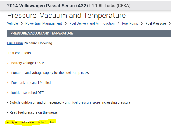 The specifications indicate 3.5 to 4.3 bar. That is around 60 PSI. You will need a fuel pressure gauge. If you don't have one, most parts stores will lend one to you.